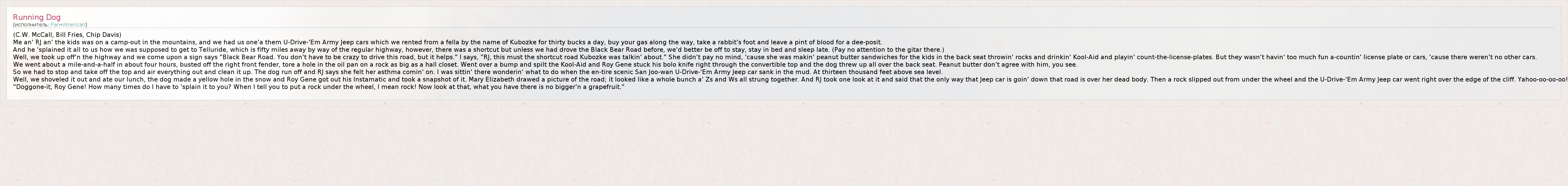 (C.W. McCall, Bill Fries, Chip Davis) Me an' RJ an' the kids was on a camp-out in the mountains, and we had us one'a them U-Drive-'Em Army Jeep cars which we rented from a fella by the name of Kubozke for thirty bucks a day, buy your gas along the way, take a rabbit's foot and leave a pint of blood for a dee-posit. And he 'splained it all to us how we was supposed to get to Telluride, which is fifty miles away by way of the regular highway, however, there was a shortcut but unless we had drove the Black Bear Road before, we'd better be off to stay, stay in bed and sleep late. (Pay no attention to the gitar there.) Well, we took up off'n the highway and we come upon a sign says "Black Bear Road. You don't have to be crazy to drive this road, but it helps." I says, "RJ, this must the shortcut road Kubozke was talkin' about." She didn't pay no mind, 'cause she was makin' peanut butter sandwiches for the kids in the back seat throwin' rocks and drinkin' Kool-Aid and playin' count-the-license-plates. But they wasn't havin' too much fun a-countin' license plate or cars, 'cause there weren't no other cars. We went about a mile-and-a-half in about four hours, busted off the right front fender, tore a hole in the oil pan on a rock as big as a hall closet. Went over a bump and spilt the Kool-Aid and Roy Gene stuck his bolo knife right through the convertible top and the dog threw up all over the back seat. Peanut butter don't agree with him, you see. So we had to stop and take off the top and air everything out and clean it up. The dog run off and RJ says she felt her asthma comin' on. I was sittin' there wonderin' what to do when the en-tire scenic San Joo-wan U-Drive-'Em Army Jeep car sank in the mud. At thirteen thousand feet above sea level. Well, we shoveled it out and ate our lunch, the dog made a yellow hole in the snow and Roy Gene got out his Instamatic and took a snapshot of it. Mary Elizabeth drawed a picture of the road; it looked like a whole bunch a' Zs and Ws all strung together. And RJ took one look at it and said that the only way that Jeep car is goin' down that road is over her dead body. Then a rock slipped out from under the wheel and the U-Drive-'Em Army Jeep car went right over the edge of the cliff. Yahoo-oo-oo-oo! "Doggone-it, Roy Gene! How many times do I have to 'splain it to you? When I tell you to put a rock under the wheel, I mean rock! Now look at that, what you have there is no bigger'n a grapefruit."
