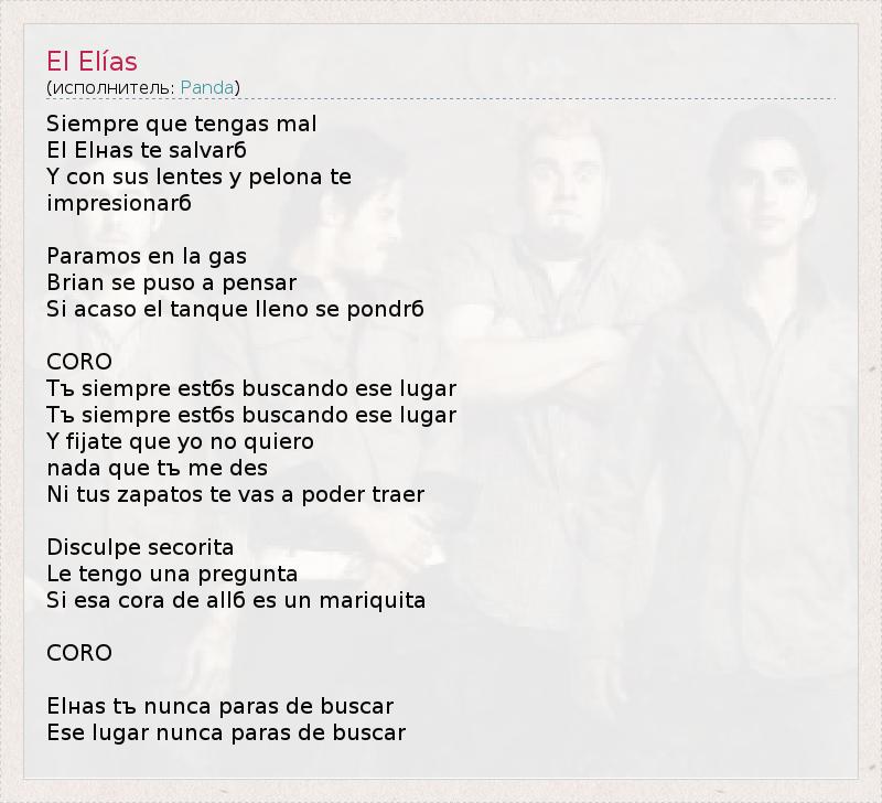 Siempre que tengas mal El Elнas te salvarб Y con sus lentes y pelona te impresionarб Paramos en la gas Brian se puso a pensar Si acaso el tanque lleno se pondrб CORO Tъ siempre estбs buscando ese lugar Tъ siempre estбs buscando ese lugar Y fijate que yo no quiero nada que tъ me des Ni tus zapatos te vas a poder traer Disculpe seсorita Le tengo una pregunta Si esa сora de allб es un mariquita CORO Elнas tъ nunca paras de buscar Ese lugar nunca paras de buscar
