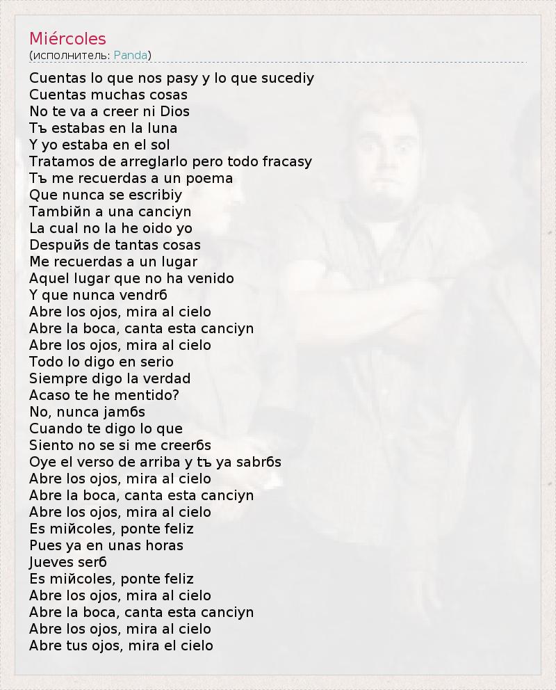 Cuentas lo que nos pasу y lo que sucediу Cuentas muchas cosas No te va a creer ni Dios Tъ estabas en la luna Y yo estaba en el sol Tratamos de arreglarlo pero todo fracasу Tъ me recuerdas a un poema Que nunca se escribiу Tambiйn a una canciуn La cual no la he oido yo Despuйs de tantas cosas Me recuerdas a un lugar Aquel lugar que no ha venido Y que nunca vendrб Abre los ojos, mira al cielo Abre la boca, canta esta canciуn Abre los ojos, mira al cielo Todo lo digo en serio Siempre digo la verdad Acaso te he mentido? No, nunca jamбs Cuando te digo lo que Siento no se si me creerбs Oye el verso de arriba y tъ ya sabrбs Abre los ojos, mira al cielo Abre la boca, canta esta canciуn Abre los ojos, mira al cielo Es miйcoles, ponte feliz Pues ya en unas horas Jueves serб Es miйcoles, ponte feliz Abre los ojos, mira al cielo Abre la boca, canta esta canciуn Abre los ojos, mira al cielo Abre tus ojos, mira el cielo
