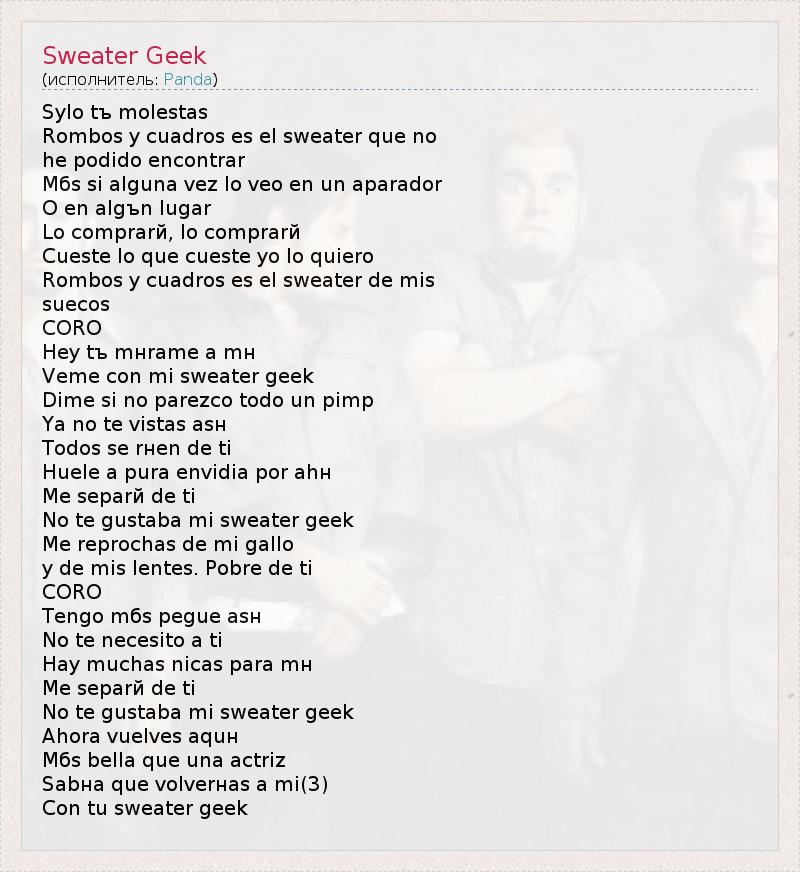 Sуlo tъ molestas Rombos y cuadros es el sweater que no he podido encontrar Mбs si alguna vez lo veo en un aparador O en algъn lugar Lo comprarй, lo comprarй Cueste lo que cueste yo lo quiero Rombos y cuadros es el sweater de mis sueсos CORO Hey tъ mнrame a mн Veme con mi sweater geek Dime si no parezco todo un pimp Ya no te vistas asн Todos se rнen de ti Huele a pura envidia por ahн Me separй de ti No te gustaba mi sweater geek Me reprochas de mi gallo y de mis lentes. Pobre de ti CORO Tengo mбs pegue asн No te necesito a ti Hay muchas niсas para mн Me separй de ti No te gustaba mi sweater geek Ahora vuelves aquн Mбs bella que una actriz Sabнa que volverнas a mi(3) Con tu sweater geek