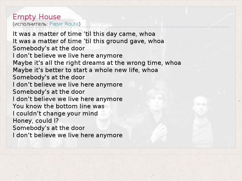 It was a matter of time 'til this day came, whoa It was a matter of time 'til this ground gave, whoa Somebody's at the door I don't believe we live here anymore Maybe it's all the right dreams at the wrong time, whoa Maybe it's better to start a whole new life, whoa Somebody's at the door I don't believe we live here anymore Somebody's at the door I don't believe we live here anymore You know the bottom line was I couldn't change your mind Honey, could I? Somebody's at the door I don't believe we live here anymore