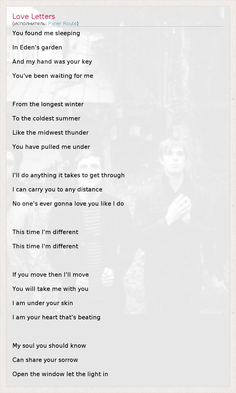 You found me sleeping In Eden's garden And my hand was your key You've been waiting for me From the longest winter To the coldest summer Like the midwest thunder You have pulled me under I'll do anything it takes to get through I can carry you to any distance No one's ever gonna love you like I do This time I'm different This time I'm different If you move then I'll move You will take me with you I am under your skin I am your heart that's beating My soul you should know Can share your sorrow Open the window let the light in