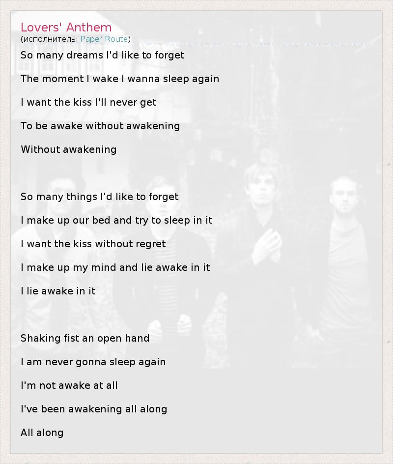 So many dreams I'd like to forget The moment I wake I wanna sleep again I want the kiss I'll never get To be awake without awakening Without awakening So many things I'd like to forget I make up our bed and try to sleep in it I want the kiss without regret I make up my mind and lie awake in it I lie awake in it Shaking fist an open hand I am never gonna sleep again I'm not awake at all I've been awakening all along All along