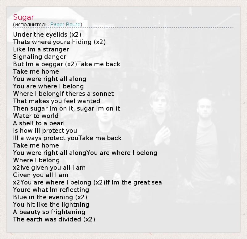 Under the eyelids (x2) Thats where youre hiding (x2) Like Im a stranger Signaling danger But Im a beggar (x2)Take me back Take me home You were right all along You are where I belong Where I belongIf theres a sonnet That makes you feel wanted Then sugar Im on it, sugar Im on it Water to world A shell to a pearl Is how Ill protect you Ill always protect youTake me back Take me home You were right all alongYou are where I belong Where I belong x2Ive given you all I am Given you all I am x2You are where I belong (x2)If Im the great sea Youre what Im reflecting Blue in the evening (x2) You hit like the lightning A beauty so frightening The earth was divided (x2)