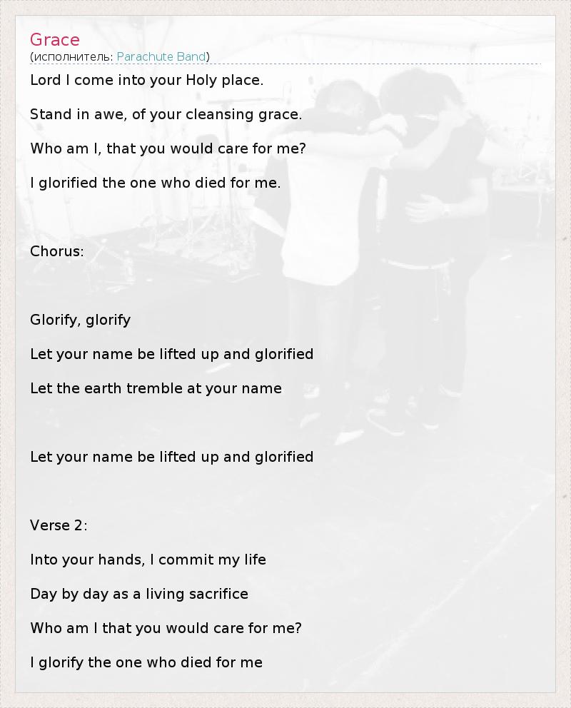 Lord I come into your Holy place. Stand in awe, of your cleansing grace. Who am I, that you would care for me? I glorified the one who died for me. Chorus: Glorify, glorify Let your name be lifted up and glorified Let the earth tremble at your name Let your name be lifted up and glorified Verse 2: Into your hands, I commit my life Day by day as a living sacrifice Who am I that you would care for me? I glorify the one who died for me