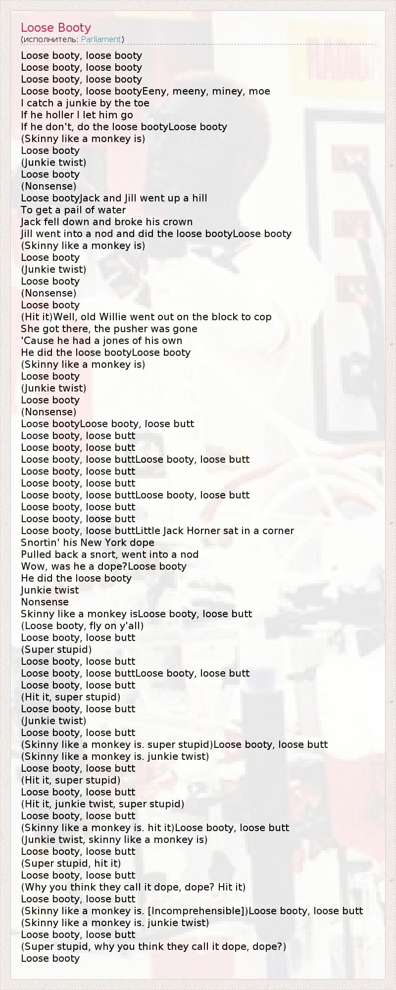 Loose booty, loose booty Loose booty, loose booty Loose booty, loose booty Loose booty, loose bootyEeny, meeny, miney, moe I catch a junkie by the toe If he holler I let him go If he don't, do the loose bootyLoose booty (Skinny like a monkey is) Loose booty (Junkie twist) Loose booty (Nonsense) Loose bootyJack and Jill went up a hill To get a pail of water Jack fell down and broke his crown Jill went into a nod and did the loose bootyLoose booty (Skinny like a monkey is) Loose booty (Junkie twist) Loose booty (Nonsense) Loose booty (Hit it)Well, old Willie went out on the block to cop She got there, the pusher was gone 'Cause he had a jones of his own He did the loose bootyLoose booty (Skinny like a monkey is) Loose booty (Junkie twist) Loose booty (Nonsense) Loose bootyLoose booty, loose butt Loose booty, loose butt Loose booty, loose butt Loose booty, loose buttLoose booty, loose butt Loose booty, loose butt Loose booty, loose butt Loose booty, loose buttLoose booty, loose butt Loose booty, loose butt Loose booty, loose butt Loose booty, loose buttLittle Jack Horner sat in a corner Snortin' his New York dope Pulled back a snort, went into a nod Wow, was he a dope?Loose booty He did the loose booty Junkie twist Nonsense Skinny like a monkey isLoose booty, loose butt (Loose booty, fly on y'all) Loose booty, loose butt (Super stupid) Loose booty, loose butt Loose booty, loose buttLoose booty, loose butt Loose booty, loose butt (Hit it, super stupid) Loose booty, loose butt (Junkie twist) Loose booty, loose butt (Skinny like a monkey is. super stupid)Loose booty, loose butt (Skinny like a monkey is. junkie twist) Loose booty, loose butt (Hit it, super stupid) Loose booty, loose butt (Hit it, junkie twist, super stupid) Loose booty, loose butt (Skinny like a monkey is. hit it)Loose booty, loose butt (Junkie twist, skinny like a monkey is) Loose booty, loose butt (Super stupid, hit it) Loose booty, loose butt (Why you think they call it dope, dope? Hit it) Loose booty, loose butt (Skinny like a monkey is. [Incomprehensible])Loose booty, loose butt (Skinny like a monkey is. junkie twist) Loose booty, loose butt (Super stupid, why you think they call it dope, dope?) Loose booty