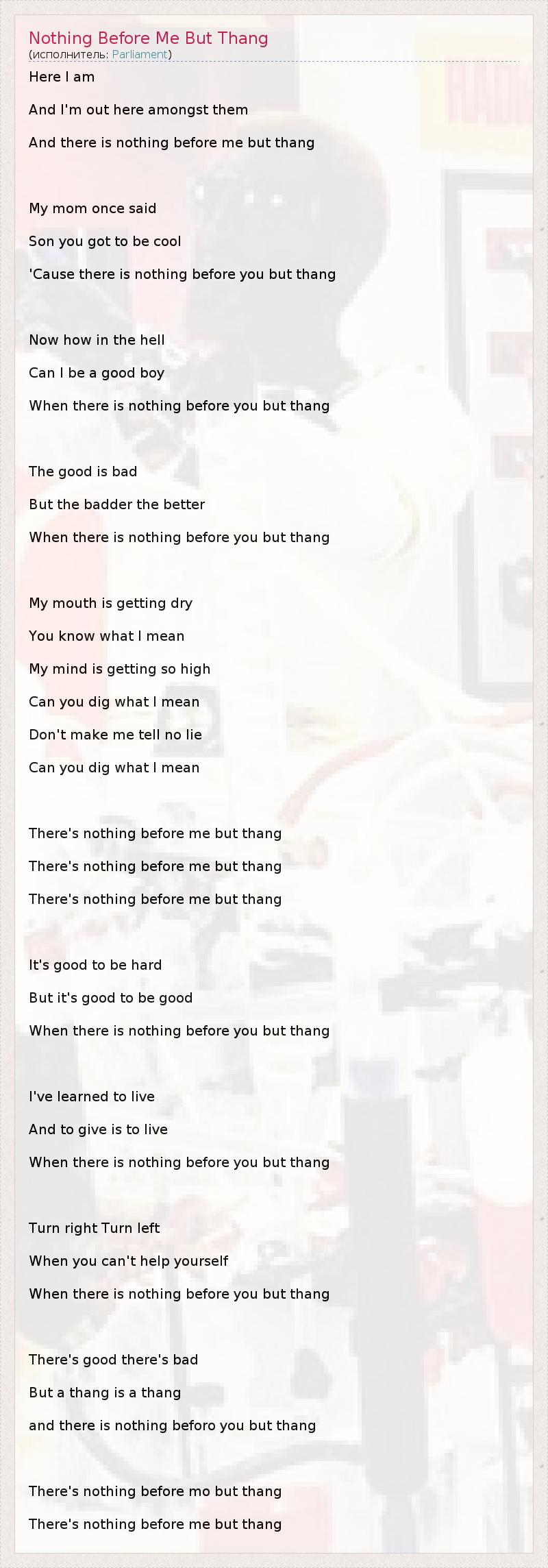 Here I am And I'm out here amongst them And there is nothing before me but thang My mom once said Son you got to be cool 'Cause there is nothing before you but thang Now how in the hell Can I be a good boy When there is nothing before you but thang The good is bad But the badder the better When there is nothing before you but thang My mouth is getting dry You know what I mean My mind is getting so high Can you dig what I mean Don't make me tell no lie Can you dig what I mean There's nothing before me but thang There's nothing before me but thang There's nothing before me but thang It's good to be hard But it's good to be good When there is nothing before you but thang I've learned to live And to give is to live When there is nothing before you but thang Turn right Turn left When you can't help yourself When there is nothing before you but thang There's good there's bad But a thang is a thang and there is nothing beforo you but thang There's nothing before mo but thang There's nothing before me but thang