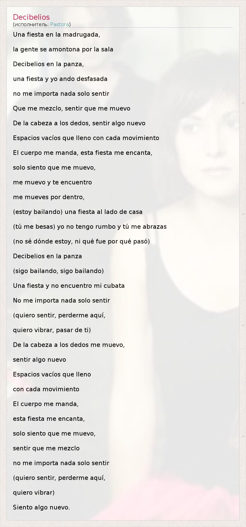 Una fiesta en la madrugada, la gente se amontona por la sala Decibelios en la panza, una fiesta y yo ando desfasada no me importa nada solo sentir Que me mezclo, sentir que me muevo De la cabeza a los dedos, sentir algo nuevo Espacios vacíos que lleno con cada movimiento El cuerpo me manda, esta fiesta me encanta, solo siento que me muevo, me muevo y te encuentro me mueves por dentro, (estoy bailando) una fiesta al lado de casa (tú me besas) yo no tengo rumbo y tú me abrazas (no sé dónde estoy, ni qué fue por qué pasó) Decibelios en la panza (sigo bailando, sigo bailando) Una fiesta y no encuentro mi cubata No me importa nada solo sentir (quiero sentir, perderme aquí, quiero vibrar, pasar de ti) De la cabeza a los dedos me muevo, sentir algo nuevo Espacios vacíos que lleno con cada movimiento El cuerpo me manda, esta fiesta me encanta, solo siento que me muevo, sentir que me mezclo no me importa nada solo sentir (quiero sentir, perderme aquí, quiero vibrar) Siento algo nuevo.