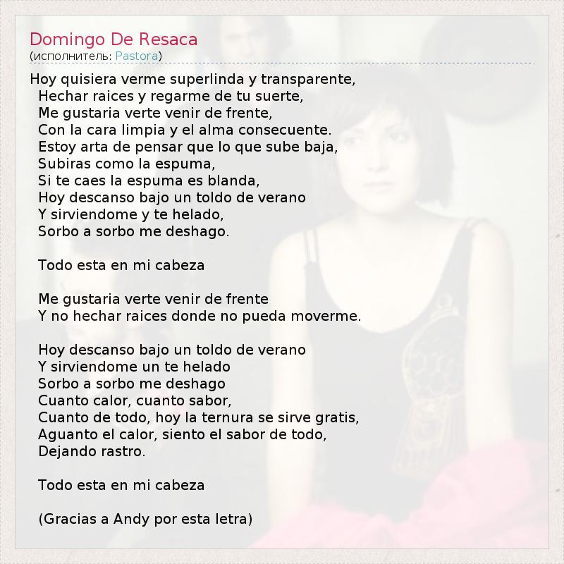 Hoy quisiera verme superlinda y transparente, Hechar raices y regarme de tu suerte, Me gustaria verte venir de frente, Con la cara limpia y el alma consecuente. Estoy arta de pensar que lo que sube baja, Subiras como la espuma, Si te caes la espuma es blanda, Hoy descanso bajo un toldo de verano Y sirviendome y te helado, Sorbo a sorbo me deshago. Todo esta en mi cabeza Me gustaria verte venir de frente Y no hechar raices donde no pueda moverme. Hoy descanso bajo un toldo de verano Y sirviendome un te helado Sorbo a sorbo me deshago Cuanto calor, cuanto sabor, Cuanto de todo, hoy la ternura se sirve gratis, Aguanto el calor, siento el sabor de todo, Dejando rastro. Todo esta en mi cabeza (Gracias a Andy por esta letra)