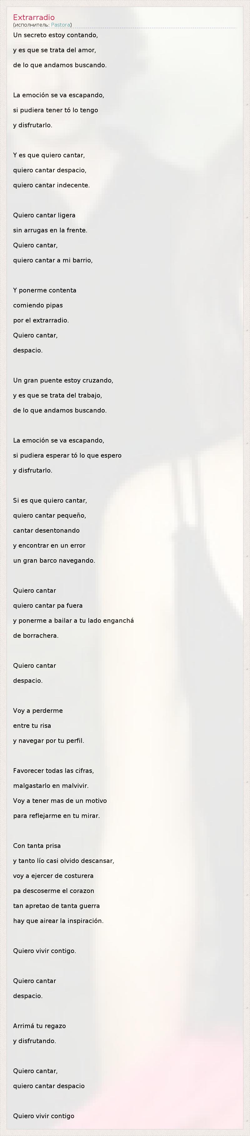 Un secreto estoy contando, y es que se trata del amor, de lo que andamos buscando. La emoción se va escapando, si pudiera tener tó lo tengo y disfrutarlo. Y es que quiero cantar, quiero cantar despacio, quiero cantar indecente. Quiero cantar ligera sin arrugas en la frente. Quiero cantar, quiero cantar a mi barrio, Y ponerme contenta comiendo pipas por el extrarradio. Quiero cantar, despacio. Un gran puente estoy cruzando, y es que se trata del trabajo, de lo que andamos buscando. La emoción se va escapando, si pudiera esperar tó lo que espero y disfrutarlo. Si es que quiero cantar, quiero cantar pequeño, cantar desentonando y encontrar en un error un gran barco navegando. Quiero cantar quiero cantar pa fuera y ponerme a bailar a tu lado enganchá de borrachera. Quiero cantar despacio. Voy a perderme entre tu risa y navegar por tu perfil. Favorecer todas las cifras, malgastarlo en malvivir. Voy a tener mas de un motivo para reflejarme en tu mirar. Con tanta prisa y tanto lío casi olvido descansar, voy a ejercer de costurera pa descoserme el corazon tan apretao de tanta guerra hay que airear la inspiración. Quiero vivir contigo. Quiero cantar despacio. Arrimá tu regazo y disfrutando. Quiero cantar, quiero cantar despacio Quiero vivir contigo