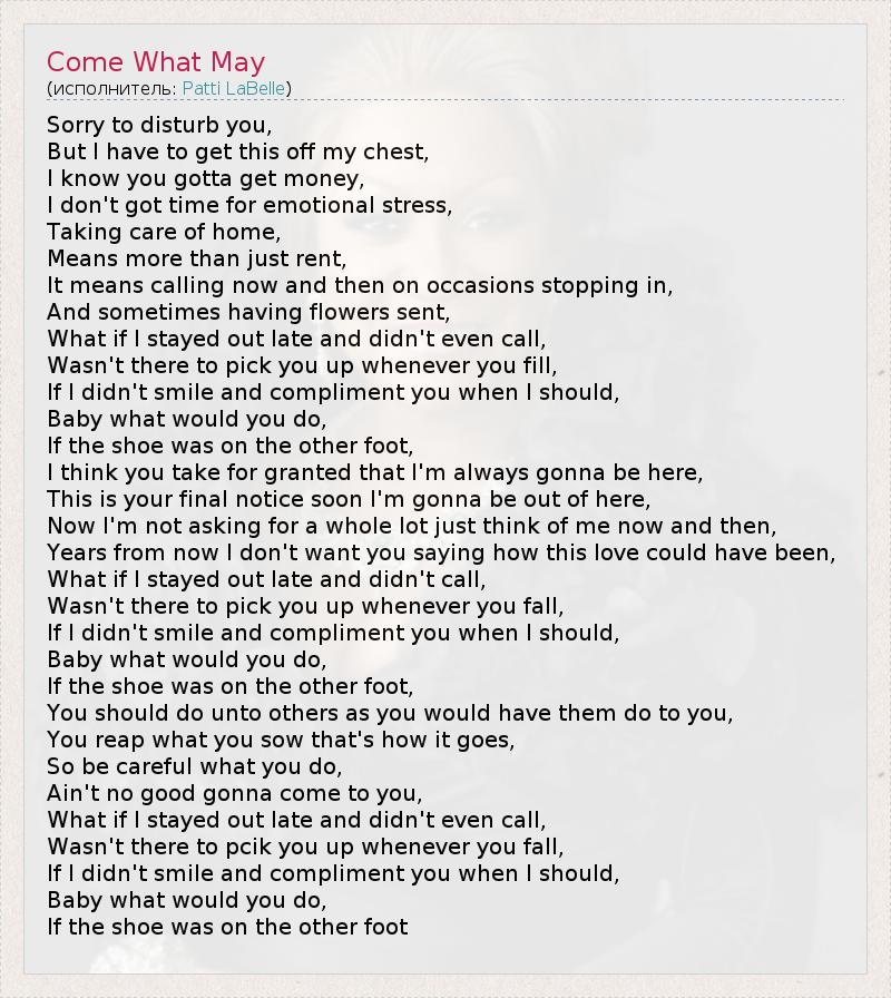 Это интересно:Patti LaBelle (born Patricia Louise Holte; May 24, 1944) is an American singer and actress. She fronted two groups, Patti LaBelle and the Bluebelles, which received minor success on the pop charts in the 1960s, and Labelle, which received acclaim and a mainstream breakthrough in 1974 with their song "Lady Marmalade". She went on to have a solo recording career, earning another U.S. #1 single in 1986 with "On My Own", a duet with Michael McDonald.She is renowned for her passionate stage performances, wide vocal range and distinctive high-octave belting. Her biography, Don't Block the Blessings, remained at the top of The New York... продолжение