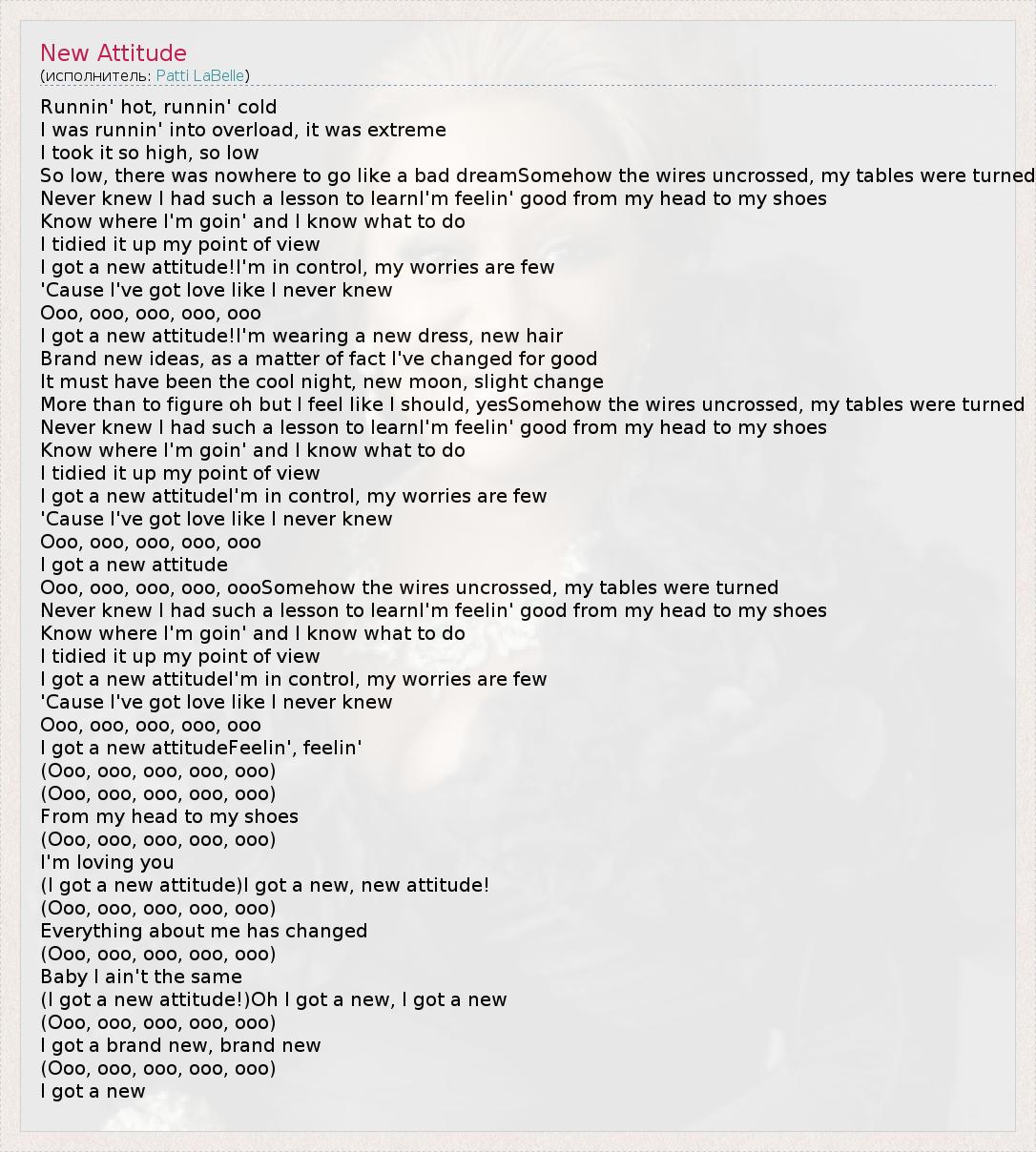 Runnin' hot, runnin' cold I was runnin' into overload, it was extreme I took it so high, so low So low, there was nowhere to go like a bad dreamSomehow the wires uncrossed, my tables were turned Never knew I had such a lesson to learnI'm feelin' good from my head to my shoes Know where I'm goin' and I know what to do I tidied it up my point of view I got a new attitude!I'm in control, my worries are few 'Cause I've got love like I never knew Ooo, ooo, ooo, ooo, ooo I got a new attitude!I'm wearing a new dress, new hair Brand new ideas, as a matter of fact I've changed for good It must have been the cool night, new moon, slight change More than to figure oh but I feel like I should, yesSomehow the wires uncrossed, my tables were turned Never knew I had such a lesson to learnI'm feelin' good from my head to my shoes Know where I'm goin' and I know what to do I tidied it up my point of view I got a new attitudeI'm in control, my worries are few 'Cause I've got love like I never knew Ooo, ooo, ooo, ooo, ooo I got a new attitude Ooo, ooo, ooo, ooo, oooSomehow the wires uncrossed, my tables were turned Never knew I had such a lesson to learnI'm feelin' good from my head to my shoes Know where I'm goin' and I know what to do I tidied it up my point of view I got a new attitudeI'm in control, my worries are few 'Cause I've got love like I never knew Ooo, ooo, ooo, ooo, ooo I got a new attitudeFeelin', feelin' (Ooo, ooo, ooo, ooo, ooo) (Ooo, ooo, ooo, ooo, ooo) From my head to my shoes (Ooo, ooo, ooo, ooo, ooo) I'm loving you (I got a new attitude)I got a new, new attitude! (Ooo, ooo, ooo, ooo, ooo) Everything about me has changed (Ooo, ooo, ooo, ooo, ooo) Baby I ain't the same (I got a new attitude!)Oh I got a new, I got a new (Ooo, ooo, ooo, ooo, ooo) I got a brand new, brand new (Ooo, ooo, ooo, ooo, ooo) I got a new