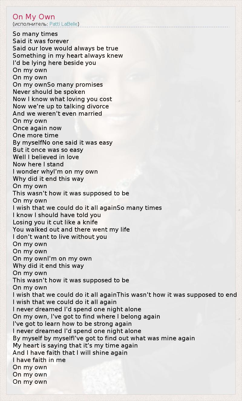 So many times Said it was forever Said our love would always be true Something in my heart always knew I'd be lying here beside you On my own On my own On my ownSo many promises Never should be spoken Now I know what loving you cost Now we're up to talking divorce And we weren't even married On my own Once again now One more time By myselfNo one said it was easy But it once was so easy Well I believed in love Now here I stand I wonder whyI'm on my own Why did it end this way On my own This wasn't how it was supposed to be On my own I wish that we could do it all againSo many times I know I should have told you Losing you it cut like a knife You walked out and there went my life I don't want to live without you On my own On my own On my ownI'm on my own Why did it end this way On my own This wasn't how it was supposed to be On my own I wish that we could do it all againThis wasn't how it was supposed to end I wish that we could do it all again I never dreamed I'd spend one night alone On my own, I've got to find where I belong again I've got to learn how to be strong again I never dreamed I'd spend one night alone By myself by myselfI've got to find out what was mine again My heart is saying that it's my time again And I have faith that I will shine again I have faith in me On my own On my own On my own