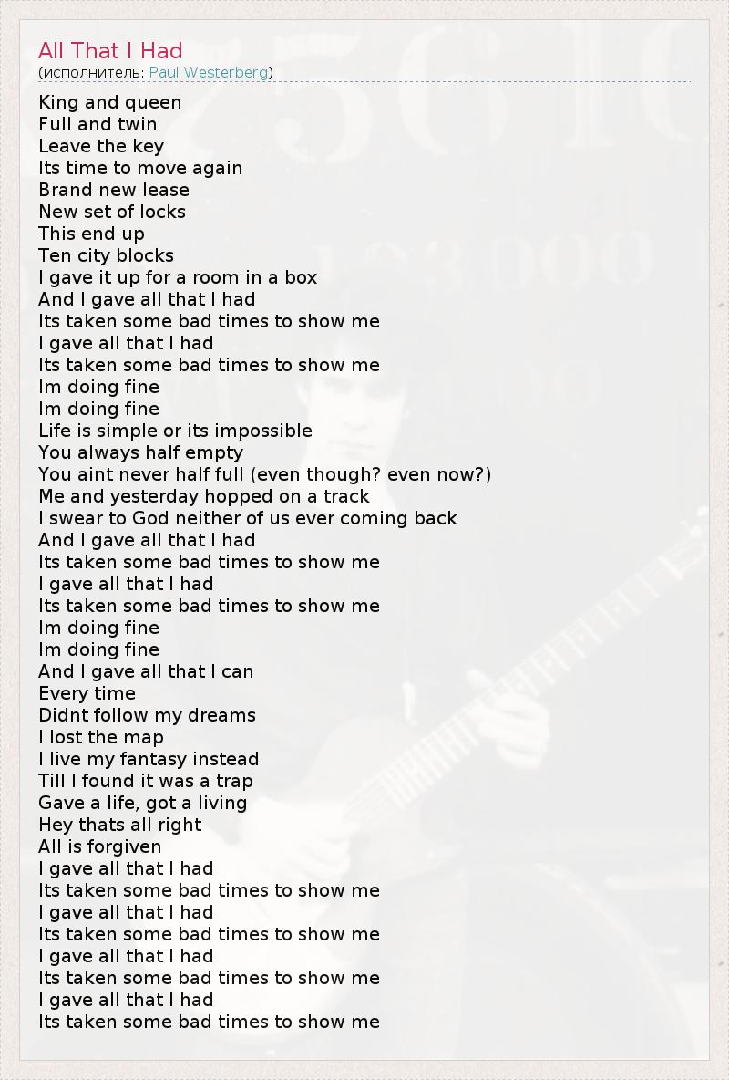 King and queen Full and twin Leave the key Its time to move again Brand new lease New set of locks This end up Ten city blocks I gave it up for a room in a box And I gave all that I had Its taken some bad times to show me I gave all that I had Its taken some bad times to show me Im doing fine Im doing fine Life is simple or its impossible You always half empty You aint never half full (even though? even now?) Me and yesterday hopped on a track I swear to God neither of us ever coming back And I gave all that I had Its taken some bad times to show me I gave all that I had Its taken some bad times to show me Im doing fine Im doing fine And I gave all that I can Every time Didnt follow my dreams I lost the map I live my fantasy instead Till I found it was a trap Gave a life, got a living Hey thats all right All is forgiven I gave all that I had Its taken some bad times to show me I gave all that I had Its taken some bad times to show me I gave all that I had Its taken some bad times to show me I gave all that I had Its taken some bad times to show me