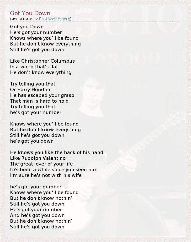 Got you Down He's got your number Knows where you'll be found But he don't know everything Still he's got you down Like Christopher Columbus In a world that's flat He don't know everything Try telling you that Or Harry Houdini He has escaped your grasp That man is hard to hold Try telling you that he's got your number Knows where you'll be found But he don't know everything Still he's got you down he's got you down He knows you like the back of his hand Like Rudolph Valentino The great lover of your life It?s been a while since you seen him I'm sure he's not with his wife he's got your number Knows where you'll be found But he don't know nothin' Still he's got you down He's got your number And he's got you down But he don't know nothin' Still he's got you down