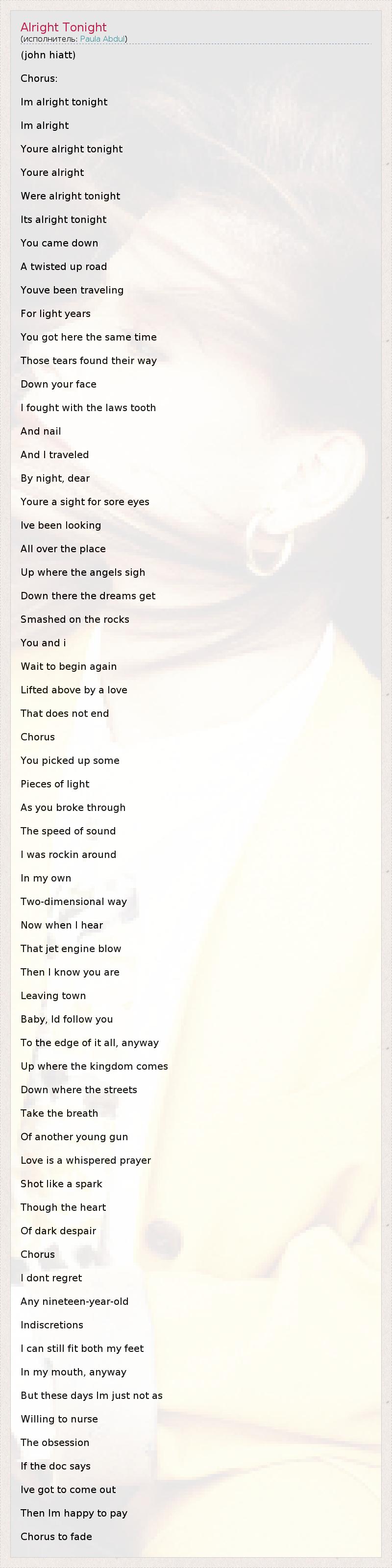 (john hiatt) Chorus: Im alright tonight Im alright Youre alright tonight Youre alright Were alright tonight Its alright tonight You came down A twisted up road Youve been traveling For light years You got here the same time Those tears found their way Down your face I fought with the laws tooth And nail And I traveled By night, dear Youre a sight for sore eyes Ive been looking All over the place Up where the angels sigh Down there the dreams get Smashed on the rocks You and i Wait to begin again Lifted above by a love That does not end Chorus You picked up some Pieces of light As you broke through The speed of sound I was rockin around In my own Two-dimensional way Now when I hear That jet engine blow Then I know you are Leaving town Baby, Id follow you To the edge of it all, anyway Up where the kingdom comes Down where the streets Take the breath Of another young gun Love is a whispered prayer Shot like a spark Though the heart Of dark despair Chorus I dont regret Any nineteen-year-old Indiscretions I can still fit both my feet In my mouth, anyway But these days Im just not as Willing to nurse The obsession If the doc says Ive got to come out Then Im happy to pay Chorus to fade