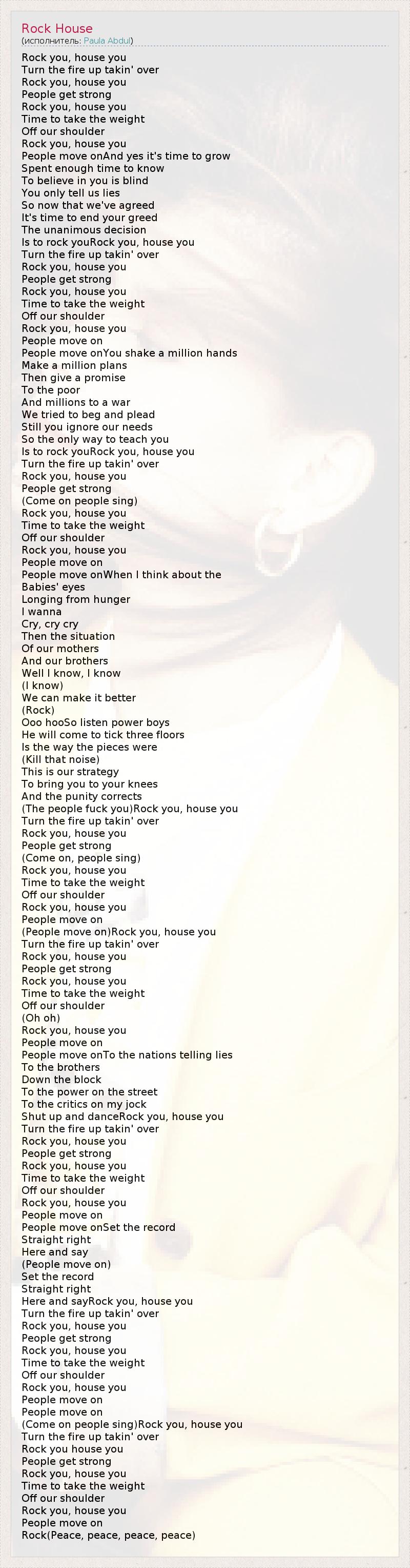 Rock you, house you Turn the fire up takin' over Rock you, house you People get strong Rock you, house you Time to take the weight Off our shoulder Rock you, house you People move onAnd yes it's time to grow Spent enough time to know To believe in you is blind You only tell us lies So now that we've agreed It's time to end your greed The unanimous decision Is to rock youRock you, house you Turn the fire up takin' over Rock you, house you People get strong Rock you, house you Time to take the weight Off our shoulder Rock you, house you People move on People move onYou shake a million hands Make a million plans Then give a promise To the poor And millions to a war We tried to beg and plead Still you ignore our needs So the only way to teach you Is to rock youRock you, house you Turn the fire up takin' over Rock you, house you People get strong (Come on people sing) Rock you, house you Time to take the weight Off our shoulder Rock you, house you People move on People move onWhen I think about the Babies' eyes Longing from hunger I wanna Cry, cry cry Then the situation Of our mothers And our brothers Well I know, I know (I know) We can make it better (Rock) Ooo hooSo listen power boys He will come to tick three floors Is the way the pieces were (Kill that noise) This is our strategy To bring you to your knees And the punity corrects (The people fuck you)Rock you, house you Turn the fire up takin' over Rock you, house you People get strong (Come on, people sing) Rock you, house you Time to take the weight Off our shoulder Rock you, house you People move on (People move on)Rock you, house you Turn the fire up takin' over Rock you, house you People get strong Rock you, house you Time to take the weight Off our shoulder (Oh oh) Rock you, house you People move on People move onTo the nations telling lies To the brothers Down the block To the power on the street To the critics on my jock Shut up and danceRock you, house you Turn the fire up takin' over Rock you, house you People get strong Rock you, house you Time to take the weight Off our shoulder Rock you, house you People move on People move onSet the record Straight right Here and say (People move on) Set the record Straight right Here and sayRock you, house you Turn the fire up takin' over Rock you, house you People get strong Rock you, house you Time to take the weight Off our shoulder Rock you, house you People move on People move on (Come on people sing)Rock you, house you Turn the fire up takin' over Rock you house you People get strong Rock you, house you Time to take the weight Off our shoulder Rock you, house you People move on Rock(Peace, peace, peace, peace)
