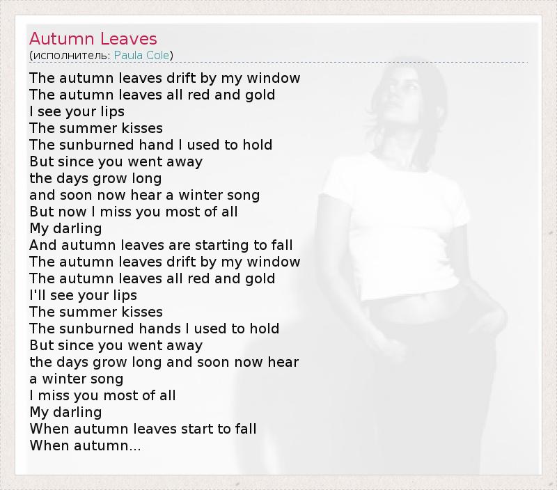The autumn leaves drift by my window The autumn leaves all red and gold I see your lips The summer kisses The sunburned hand I used to hold But since you went away the days grow long and soon now hear a winter song But now I miss you most of all My darling And autumn leaves are starting to fall The autumn leaves drift by my window The autumn leaves all red and gold I'll see your lips The summer kisses The sunburned hands I used to hold But since you went away the days grow long and soon now hear a winter song I miss you most of all My darling When autumn leaves start to fall When autumn...