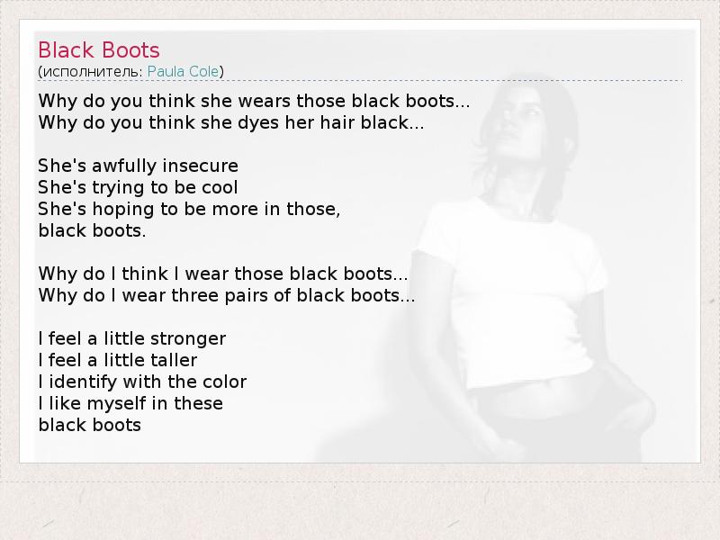 Why do you think she wears those black boots... Why do you think she dyes her hair black... She's awfully insecure She's trying to be cool She's hoping to be more in those, black boots. Why do I think I wear those black boots... Why do I wear three pairs of black boots... I feel a little stronger I feel a little taller I identify with the color I like myself in these black boots