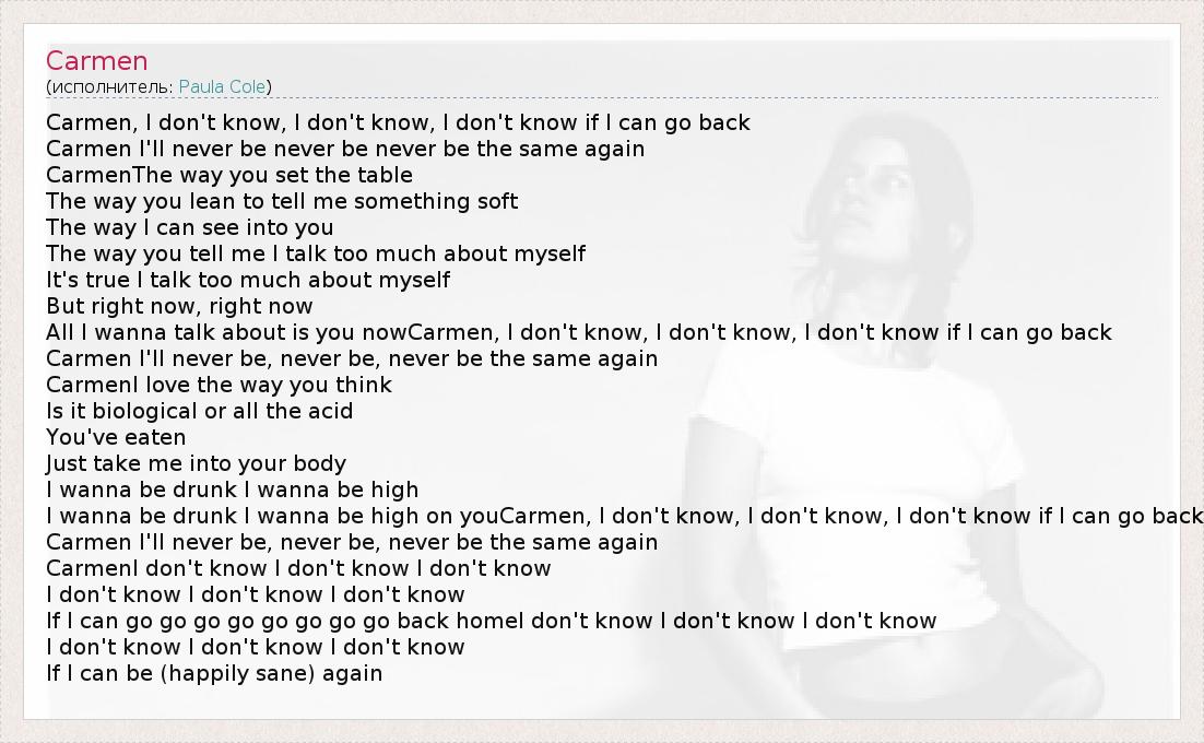 Carmen, I don't know, I don't know, I don't know if I can go back Carmen I'll never be never be never be the same again CarmenThe way you set the table The way you lean to tell me something soft The way I can see into you The way you tell me I talk too much about myself It's true I talk too much about myself But right now, right now All I wanna talk about is you nowCarmen, I don't know, I don't know, I don't know if I can go back Carmen I'll never be, never be, never be the same again CarmenI love the way you think Is it biological or all the acid You've eaten Just take me into your body I wanna be drunk I wanna be high I wanna be drunk I wanna be high on youCarmen, I don't know, I don't know, I don't know if I can go back Carmen I'll never be, never be, never be the same again CarmenI don't know I don't know I don't know I don't know I don't know I don't know If I can go go go go go go go go back homeI don't know I don't know I don't know I don't know I don't know I don't know If I can be (happily sane) again