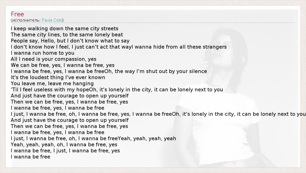 I keep walking down the same city streets The same city lines, to the same lonely beat People say, Hello, but I don't know what to say I don't know how I feel, I just can't act that wayI wanna hide from all these strangers I wanna run home to you All I need is your compassion, yes We can be free, yes, I wanna be free, yes I wanna be free, yes, I wanna be freeOh, the way I'm shut out by your silence It's the loudest thing I've ever known You leave me, leave me hanging 'Til I feel useless with my hopeOh, it's lonely in the city, it can be lonely next to you And just have the courage to open up yourself Then we can be free, yes, I wanna be free, yes I wanna be free, yes, I wanna be free I just, I wanna be free, oh, I wanna be free, yes, I wanna be freeOh, it's lonely in the city, it can be lonely next to you And just have the courage to open up yourself Then we can be free, yes, I wanna be free, yes I wanna be free, yes, I wanna be free I just, I wanna be free, oh, I wanna be freeYeah, yeah, yeah, yeah Yeah, yeah, yeah, oh, I wanna be free, yes I wanna be free, I just, I wanna be free, yes I wanna be free