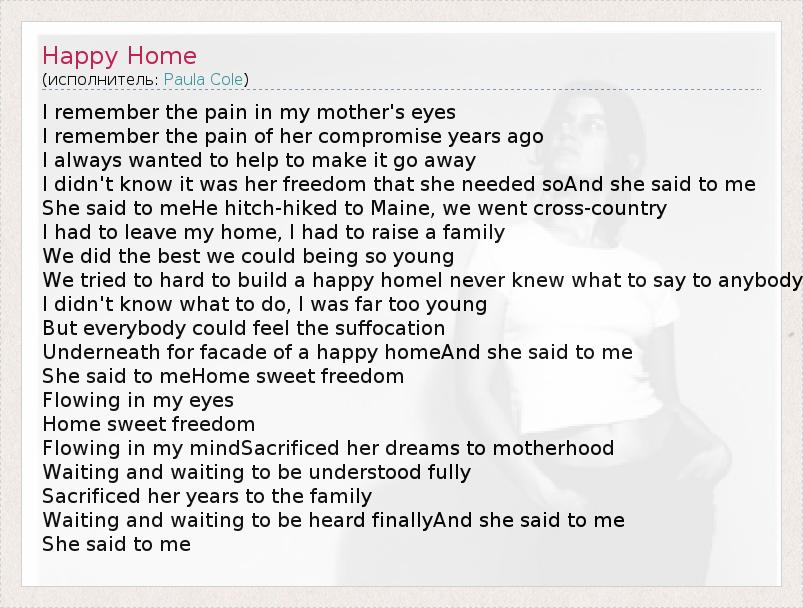 I remember the pain in my mother's eyes I remember the pain of her compromise years ago I always wanted to help to make it go away I didn't know it was her freedom that she needed soAnd she said to me She said to meHe hitch-hiked to Maine, we went cross-country I had to leave my home, I had to raise a family We did the best we could being so young We tried to hard to build a happy homeI never knew what to say to anybody I didn't know what to do, I was far too young But everybody could feel the suffocation Underneath for facade of a happy homeAnd she said to me She said to meHome sweet freedom Flowing in my eyes Home sweet freedom Flowing in my mindSacrificed her dreams to motherhood Waiting and waiting to be understood fully Sacrificed her years to the family Waiting and waiting to be heard finallyAnd she said to me She said to me