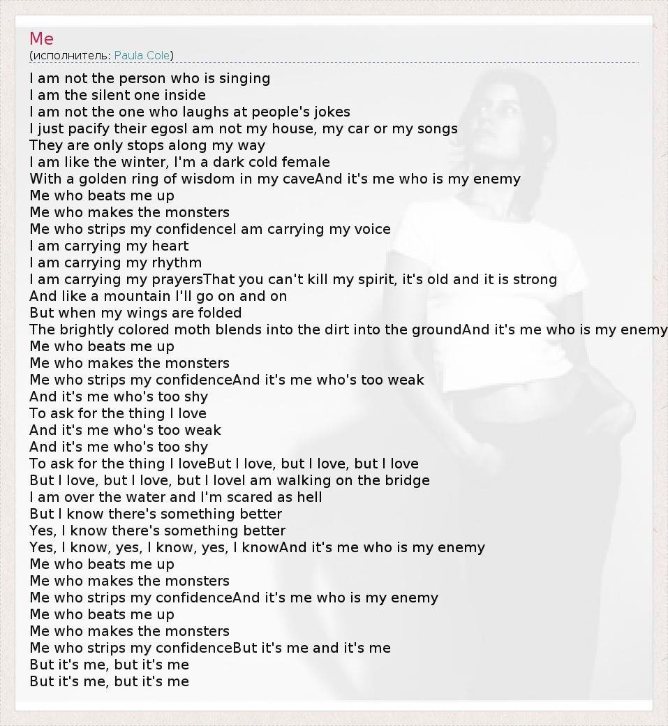 I am not the person who is singing I am the silent one inside I am not the one who laughs at people's jokes I just pacify their egosI am not my house, my car or my songs They are only stops along my way I am like the winter, I'm a dark cold female With a golden ring of wisdom in my caveAnd it's me who is my enemy Me who beats me up Me who makes the monsters Me who strips my confidenceI am carrying my voice I am carrying my heart I am carrying my rhythm I am carrying my prayersThat you can't kill my spirit, it's old and it is strong And like a mountain I'll go on and on But when my wings are folded The brightly colored moth blends into the dirt into the groundAnd it's me who is my enemy Me who beats me up Me who makes the monsters Me who strips my confidenceAnd it's me who's too weak And it's me who's too shy To ask for the thing I love And it's me who's too weak And it's me who's too shy To ask for the thing I loveBut I love, but I love, but I love But I love, but I love, but I loveI am walking on the bridge I am over the water and I'm scared as hell But I know there's something better Yes, I know there's something better Yes, I know, yes, I know, yes, I knowAnd it's me who is my enemy Me who beats me up Me who makes the monsters Me who strips my confidenceAnd it's me who is my enemy Me who beats me up Me who makes the monsters Me who strips my confidenceBut it's me and it's me But it's me, but it's me But it's me, but it's me