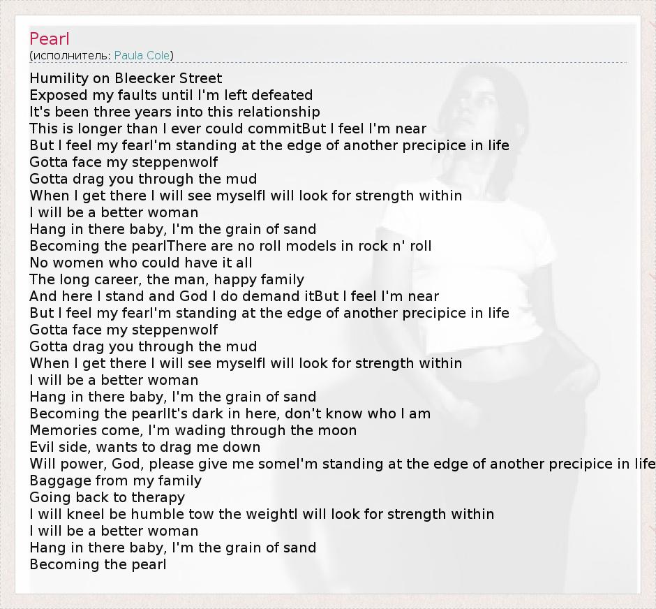 Humility on Bleecker Street Exposed my faults until I'm left defeated It's been three years into this relationship This is longer than I ever could commitBut I feel I'm near But I feel my fearI'm standing at the edge of another precipice in life Gotta face my steppenwolf Gotta drag you through the mud When I get there I will see myselfI will look for strength within I will be a better woman Hang in there baby, I'm the grain of sand Becoming the pearlThere are no roll models in rock n' roll No women who could have it all The long career, the man, happy family And here I stand and God I do demand itBut I feel I'm near But I feel my fearI'm standing at the edge of another precipice in life Gotta face my steppenwolf Gotta drag you through the mud When I get there I will see myselfI will look for strength within I will be a better woman Hang in there baby, I'm the grain of sand Becoming the pearlIt's dark in here, don't know who I am Memories come, I'm wading through the moon Evil side, wants to drag me down Will power, God, please give me someI'm standing at the edge of another precipice in life Baggage from my family Going back to therapy I will kneel be humble tow the weightI will look for strength within I will be a better woman Hang in there baby, I'm the grain of sand Becoming the pearl
