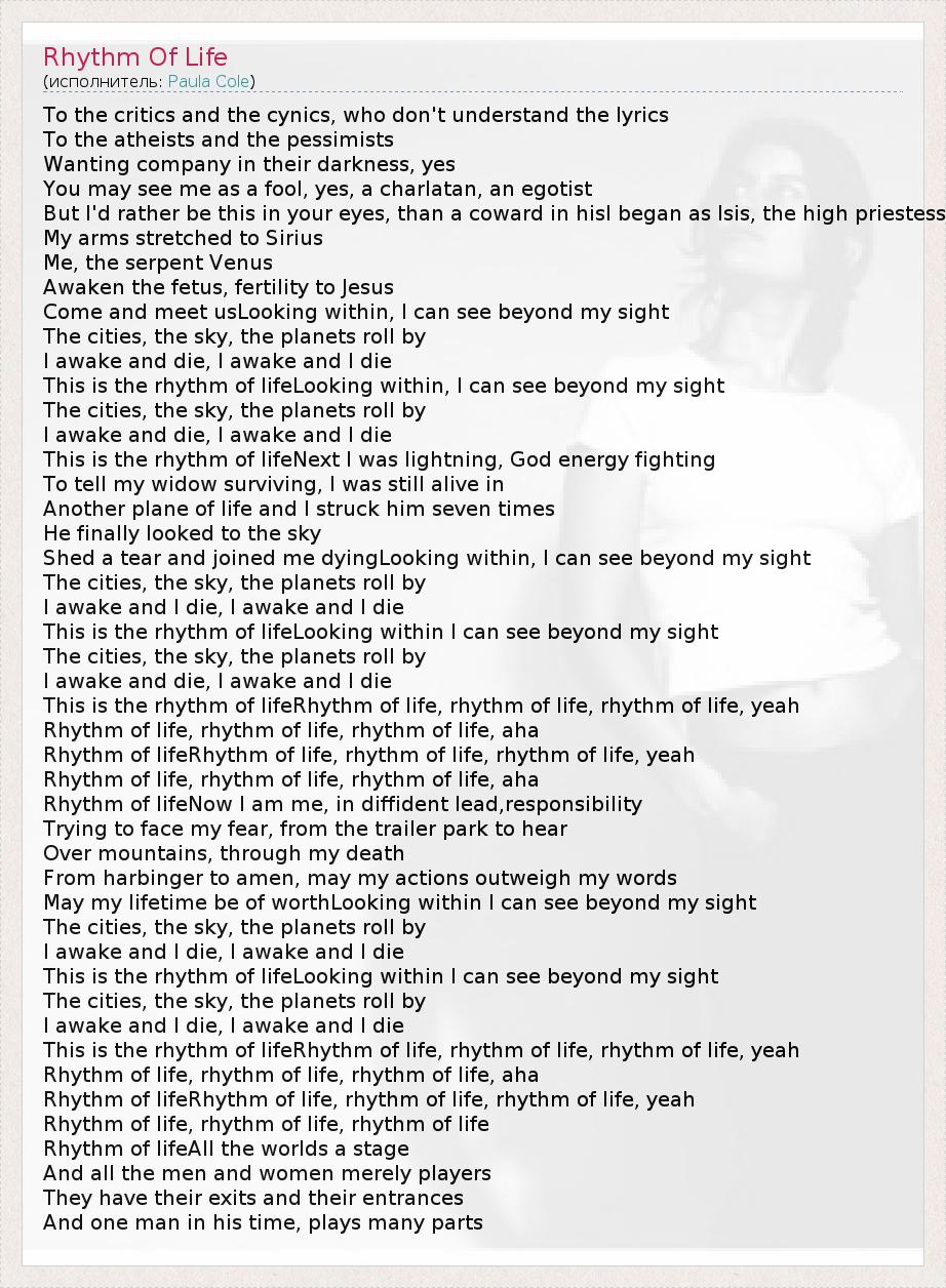 To the critics and the cynics, who don't understand the lyrics To the atheists and the pessimists Wanting company in their darkness, yes You may see me as a fool, yes, a charlatan, an egotist But I'd rather be this in your eyes, than a coward in hisI began as Isis, the high priestess My arms stretched to Sirius Me, the serpent Venus Awaken the fetus, fertility to Jesus Come and meet usLooking within, I can see beyond my sight The cities, the sky, the planets roll by I awake and die, I awake and I die This is the rhythm of lifeLooking within, I can see beyond my sight The cities, the sky, the planets roll by I awake and die, I awake and I die This is the rhythm of lifeNext I was lightning, God energy fighting To tell my widow surviving, I was still alive in Another plane of life and I struck him seven times He finally looked to the sky Shed a tear and joined me dyingLooking within, I can see beyond my sight The cities, the sky, the planets roll by I awake and I die, I awake and I die This is the rhythm of lifeLooking within I can see beyond my sight The cities, the sky, the planets roll by I awake and die, I awake and I die This is the rhythm of lifeRhythm of life, rhythm of life, rhythm of life, yeah Rhythm of life, rhythm of life, rhythm of life, aha Rhythm of lifeRhythm of life, rhythm of life, rhythm of life, yeah Rhythm of life, rhythm of life, rhythm of life, aha Rhythm of lifeNow I am me, in diffident lead,responsibility Trying to face my fear, from the trailer park to hear Over mountains, through my death From harbinger to amen, may my actions outweigh my words May my lifetime be of worthLooking within I can see beyond my sight The cities, the sky, the planets roll by I awake and I die, I awake and I die This is the rhythm of lifeLooking within I can see beyond my sight The cities, the sky, the planets roll by I awake and I die, I awake and I die This is the rhythm of lifeRhythm of life, rhythm of life, rhythm of life, yeah Rhythm of life, rhythm of life, rhythm of life, aha Rhythm of lifeRhythm of life, rhythm of life, rhythm of life, yeah Rhythm of life, rhythm of life, rhythm of life Rhythm of lifeAll the worlds a stage And all the men and women merely players They have their exits and their entrances And one man in his time, plays many parts
