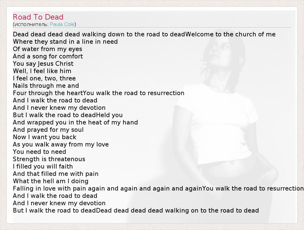 But I walk the road to deadDead dead dead dead walking on to the road to dead
