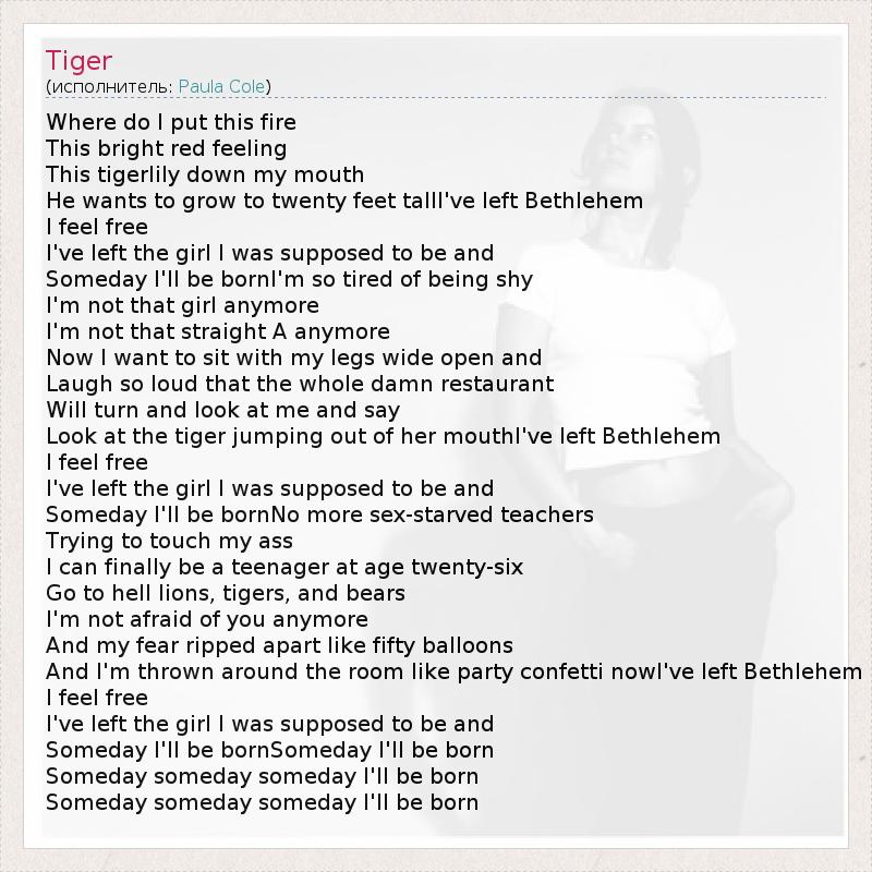 Where do I put this fire This bright red feeling This tigerlily down my mouth He wants to grow to twenty feet tallI've left Bethlehem I feel free I've left the girl I was supposed to be and Someday I'll be bornI'm so tired of being shy I'm not that girl anymore I'm not that straight A anymore Now I want to sit with my legs wide open and Laugh so loud that the whole damn restaurant Will turn and look at me and say Look at the tiger jumping out of her mouthI've left Bethlehem I feel free I've left the girl I was supposed to be and Someday I'll be bornNo more sex-starved teachers Trying to touch my ass I can finally be a teenager at age twenty-six Go to hell lions, tigers, and bears I'm not afraid of you anymore And my fear ripped apart like fifty balloons And I'm thrown around the room like party confetti nowI've left Bethlehem I feel free I've left the girl I was supposed to be and Someday I'll be bornSomeday I'll be born Someday someday someday I'll be born Someday someday someday I'll be born