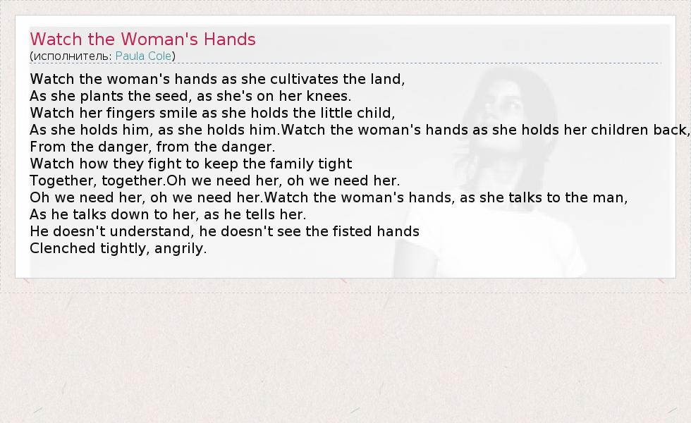 ГлавнаяИсполнителиPaula ColeWatch the Woman's Hands