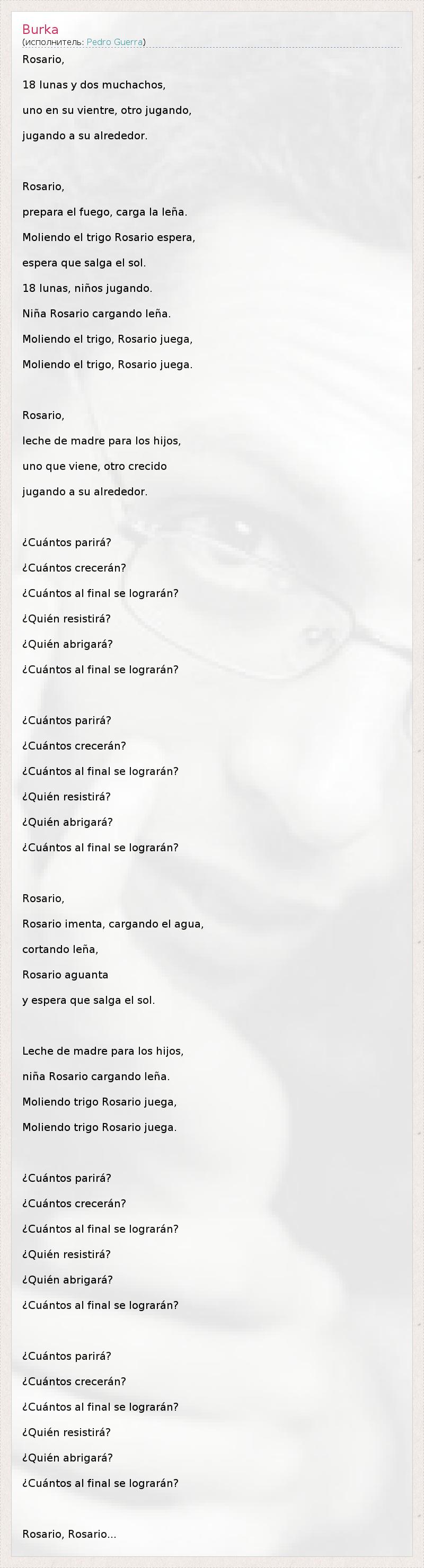 Rosario, 18 lunas y dos muchachos, uno en su vientre, otro jugando, jugando a su alrededor. Rosario, prepara el fuego, carga la leña. Moliendo el trigo Rosario espera, espera que salga el sol. 18 lunas, niños jugando. Niña Rosario cargando leña. Moliendo el trigo, Rosario juega, Moliendo el trigo, Rosario juega. Rosario, leche de madre para los hijos, uno que viene, otro crecido jugando a su alrededor. ¿Cuántos parirá? ¿Cuántos crecerán? ¿Cuántos al final se lograrán? ¿Quién resistirá? ¿Quién abrigará? ¿Cuántos al final se lograrán? ¿Cuántos parirá? ¿Cuántos crecerán? ¿Cuántos al final se lograrán? ¿Quién resistirá? ¿Quién abrigará? ¿Cuántos al final se lograrán? Rosario, Rosario imenta, cargando el agua, cortando leña, Rosario aguanta y espera que salga el sol. Leche de madre para los hijos, niña Rosario cargando leña. Moliendo trigo Rosario juega, Moliendo trigo Rosario juega. ¿Cuántos parirá? ¿Cuántos crecerán? ¿Cuántos al final se lograrán? ¿Quién resistirá? ¿Quién abrigará? ¿Cuántos al final se lograrán? ¿Cuántos parirá? ¿Cuántos crecerán? ¿Cuántos al final se lograrán? ¿Quién resistirá? ¿Quién abrigará? ¿Cuántos al final se lograrán? Rosario, Rosario...