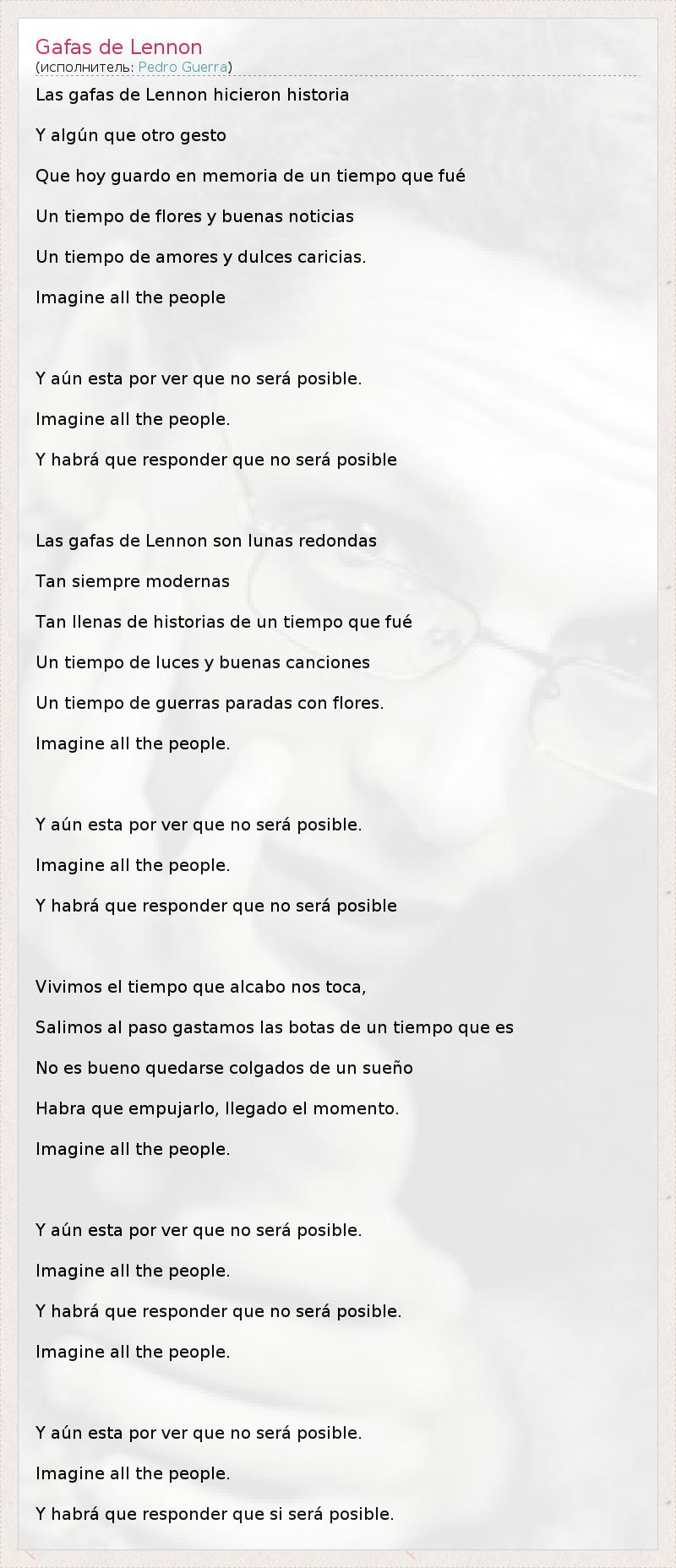Las gafas de Lennon hicieron historia Y algún que otro gesto Que hoy guardo en memoria de un tiempo que fué Un tiempo de flores y buenas noticias Un tiempo de amores y dulces caricias. Imagine all the people Y aún esta por ver que no será posible. Imagine all the people. Y habrá que responder que no será posible Las gafas de Lennon son lunas redondas Tan siempre modernas Tan llenas de historias de un tiempo que fué Un tiempo de luces y buenas canciones Un tiempo de guerras paradas con flores. Imagine all the people. Y aún esta por ver que no será posible. Imagine all the people. Y habrá que responder que no será posible Vivimos el tiempo que alcabo nos toca, Salimos al paso gastamos las botas de un tiempo que es No es bueno quedarse colgados de un sueño Habra que empujarlo, llegado el momento. Imagine all the people. Y aún esta por ver que no será posible. Imagine all the people. Y habrá que responder que no será posible. Imagine all the people. Y aún esta por ver que no será posible. Imagine all the people. Y habrá que responder que si será posible.