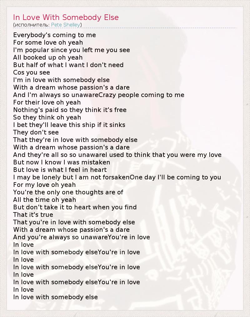 Everybody's coming to me For some love oh yeah I'm popular since you left me you see All booked up oh yeah But half of what I want I don't need Cos you see I'm in love with somebody else With a dream whose passion's a dare And I'm always so unawareCrazy people coming to me For their love oh yeah Nothing's paid so they think it's free So they think oh yeah I bet they'll leave this ship if it sinks They don't see That they're in love with somebody else With a dream whose passion's a dare And they're all so so unawareI used to think that you were my love But now I know I was mistaken But love is what I feel in heart I may be lonely but I am not forsakenOne day I'll be coming to you For my love oh yeah You're the only one thoughts are of All the time oh yeah But don't take it to heart when you find That it's true That you're in love with somebody else With a dream whose passion's a dare And you're always so unawareYou're in love In love In love with somebody elseYou're in love In love In love with somebody elseYou're in love In love In love with somebody elseYou're in love In love In love with somebody else