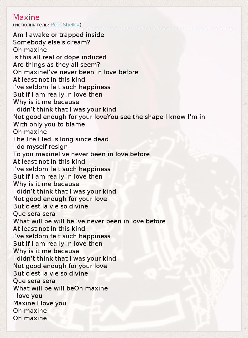 Am I awake or trapped inside Somebody else's dream? Oh maxine Is this all real or dope induced Are things as they all seem? Oh maxineI've never been in love before At least not in this kind I've seldom felt such happiness But if I am really in love then Why is it me because I didn't think that I was your kind Not good enough for your loveYou see the shape I know I'm in With only you to blame Oh maxine The life I led is long since dead I do myself resign To you maxineI've never been in love before At least not in this kind I've seldom felt such happiness But if I am really in love then Why is it me because I didn't think that I was your kind Not good enough for your love But c'est la vie so divine Que sera sera What will be will beI've never been in love before At least not in this kind I've seldom felt such happiness But if I am really in love then Why is it me because I didn't think that I was your kind Not good enough for your love But c'est la vie so divine Que sera sera What will be will beOh maxine I love you Maxine I love you Oh maxine Oh maxine