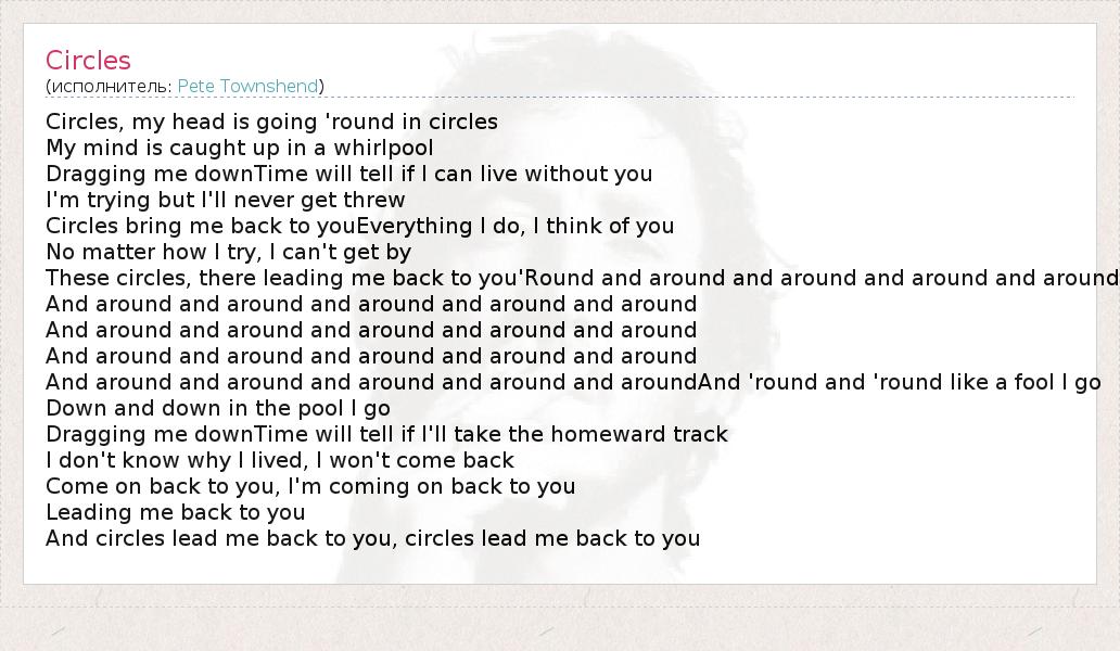 Circles, my head is going 'round in circles My mind is caught up in a whirlpool Dragging me downTime will tell if I can live without you I'm trying but I'll never get threw Circles bring me back to youEverything I do, I think of you No matter how I try, I can't get by These circles, there leading me back to you'Round and around and around and around and around And around and around and around and around and around And around and around and around and around and around And around and around and around and around and around And around and around and around and around and aroundAnd 'round and 'round like a fool I go Down and down in the pool I go Dragging me downTime will tell if I'll take the homeward track I don't know why I lived, I won't come back Come on back to you, I'm coming on back to you Leading me back to you And circles lead me back to you, circles lead me back to you