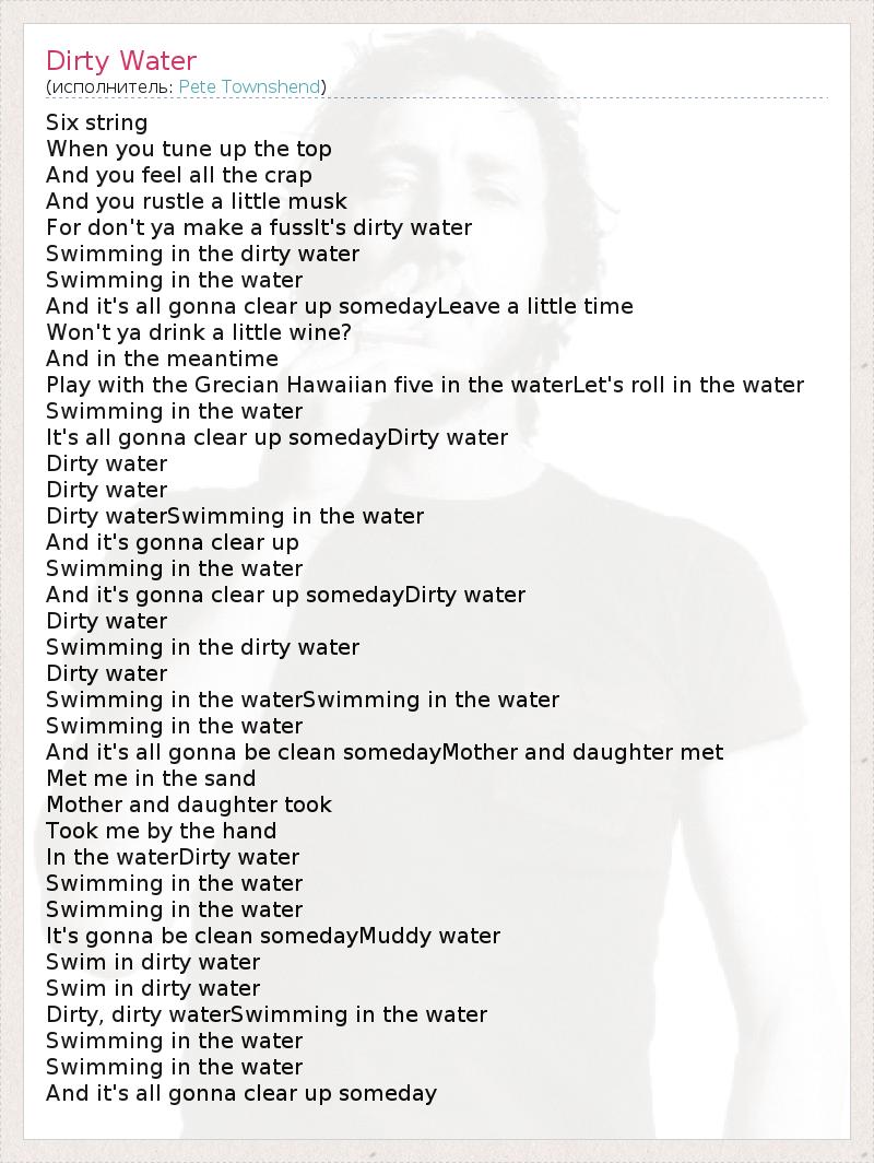 Six string When you tune up the top And you feel all the crap And you rustle a little musk For don't ya make a fussIt's dirty water Swimming in the dirty water Swimming in the water And it's all gonna clear up somedayLeave a little time Won't ya drink a little wine? And in the meantime Play with the Grecian Hawaiian five in the waterLet's roll in the water Swimming in the water It's all gonna clear up somedayDirty water Dirty water Dirty water Dirty waterSwimming in the water And it's gonna clear up Swimming in the water And it's gonna clear up somedayDirty water Dirty water Swimming in the dirty water Dirty water Swimming in the waterSwimming in the water Swimming in the water And it's all gonna be clean somedayMother and daughter met Met me in the sand Mother and daughter took Took me by the hand In the waterDirty water Swimming in the water Swimming in the water It's gonna be clean somedayMuddy water Swim in dirty water Swim in dirty water Dirty, dirty waterSwimming in the water Swimming in the water Swimming in the water And it's all gonna clear up someday