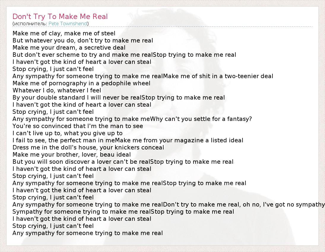 Make me of clay, make me of steel But whatever you do, don't try to make me real Make me your dream, a secretive deal But don't ever scheme to try and make me realStop trying to make me real I haven't got the kind of heart a lover can steal Stop crying, I just can't feel Any sympathy for someone trying to make me realMake me of shit in a two-teenier deal Make me of pornography in a pedophile wheel Whatever I do, whatever I feel By your double standard I will never be realStop trying to make me real I haven't got the kind of heart a lover can steal Stop crying, I just can't feel Any sympathy for someone trying to make meWhy can't you settle for a fantasy? You're so convinced that I'm the man to see I can't live up to, what you give up to I fail to see, the perfect man in meMake me from your magazine a listed ideal Dress me in the doll's house, your knickers conceal Make me your brother, lover, beau ideal But you will soon discover a lover can't be realStop trying to make me real I haven't got the kind of heart a lover can steal Stop crying, I just can't feel Any sympathy for someone trying to make me realStop trying to make me real I haven't got the kind of heart a lover can steal Stop crying, I just can't feel Any sympathy for someone trying to make me realDon't try to make me real, oh no, I've got no sympathy Sympathy for someone trying to make me realStop trying to make me real I haven't got the kind of heart a lover can steal Stop crying, I just can't feel Any sympathy for someone trying to make me real