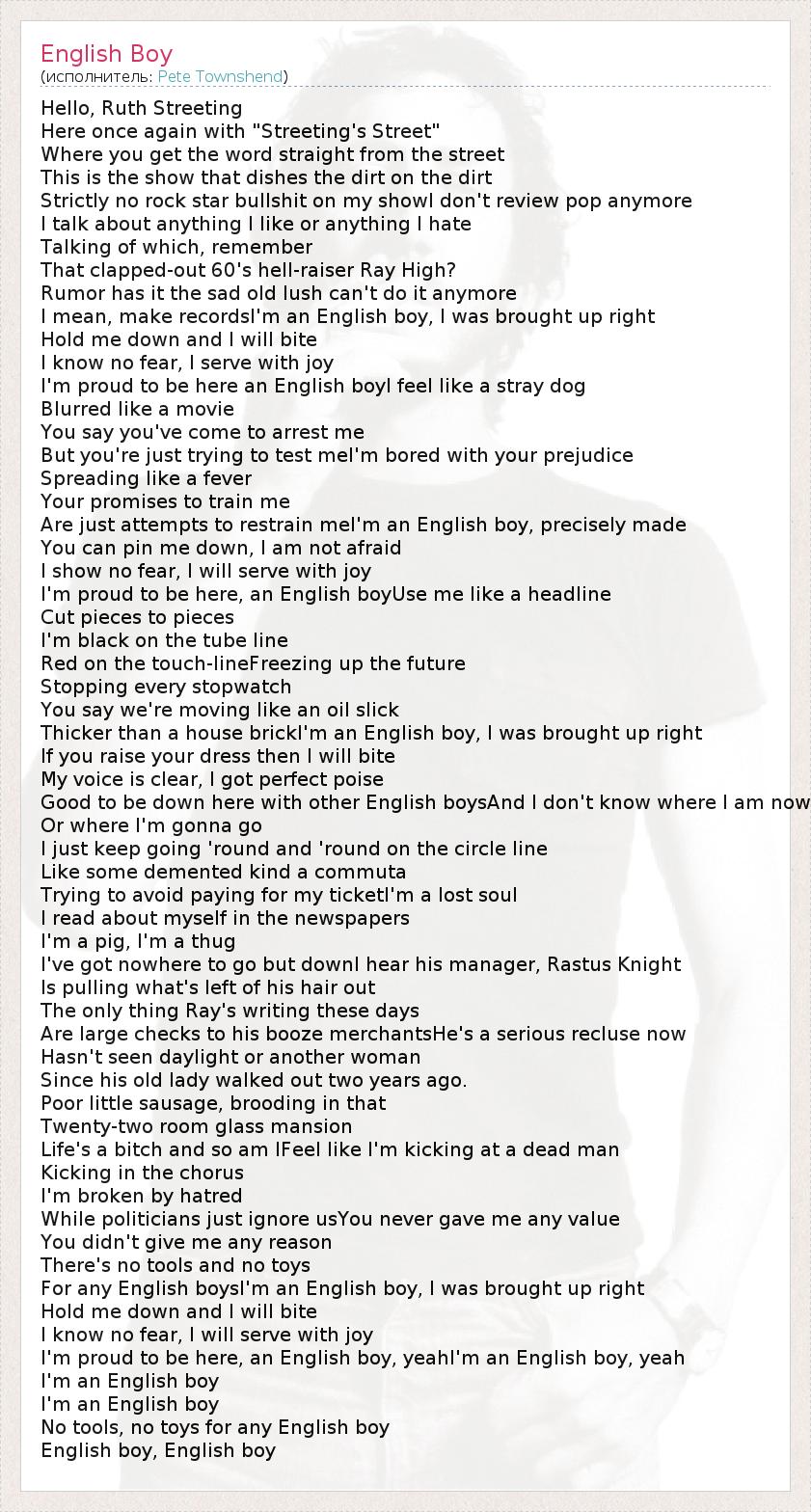 Hello, Ruth Streeting Here once again with "Streeting's Street" Where you get the word straight from the street This is the show that dishes the dirt on the dirt Strictly no rock star bullshit on my showI don't review pop anymore I talk about anything I like or anything I hate Talking of which, remember That clapped-out 60's hell-raiser Ray High? Rumor has it the sad old lush can't do it anymore I mean, make recordsI'm an English boy, I was brought up right Hold me down and I will bite I know no fear, I serve with joy I'm proud to be here an English boyI feel like a stray dog Blurred like a movie You say you've come to arrest me But you're just trying to test meI'm bored with your prejudice Spreading like a fever Your promises to train me Are just attempts to restrain meI'm an English boy, precisely made You can pin me down, I am not afraid I show no fear, I will serve with joy I'm proud to be here, an English boyUse me like a headline Cut pieces to pieces I'm black on the tube line Red on the touch-lineFreezing up the future Stopping every stopwatch You say we're moving like an oil slick Thicker than a house brickI'm an English boy, I was brought up right If you raise your dress then I will bite My voice is clear, I got perfect poise Good to be down here with other English boysAnd I don't know where I am now Or where I'm gonna go I just keep going 'round and 'round on the circle line Like some demented kind a commuta Trying to avoid paying for my ticketI'm a lost soul I read about myself in the newspapers I'm a pig, I'm a thug I've got nowhere to go but downI hear his manager, Rastus Knight Is pulling what's left of his hair out The only thing Ray's writing these days Are large checks to his booze merchantsHe's a serious recluse now Hasn't seen daylight or another woman Since his old lady walked out two years ago. Poor little sausage, brooding in that Twenty-two room glass mansion Life's a bitch and so am IFeel like I'm kicking at a dead man Kicking in the chorus I'm broken by hatred While politicians just ignore usYou never gave me any value You didn't give me any reason There's no tools and no toys For any English boysI'm an English boy, I was brought up right Hold me down and I will bite I know no fear, I will serve with joy I'm proud to be here, an English boy, yeahI'm an English boy, yeah I'm an English boy I'm an English boy No tools, no toys for any English boy English boy, English boy