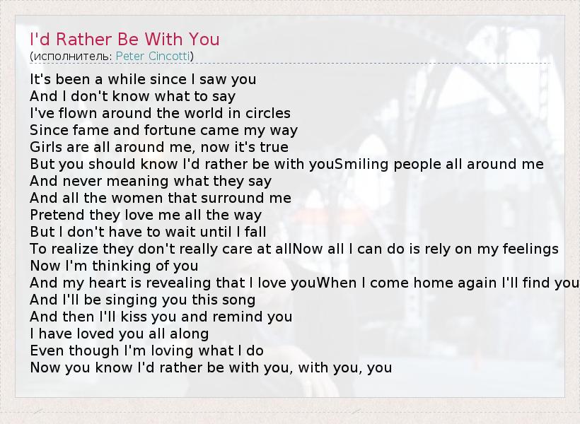 А как ты думаешь, о чем песня "I'd Rather Be With You" ?