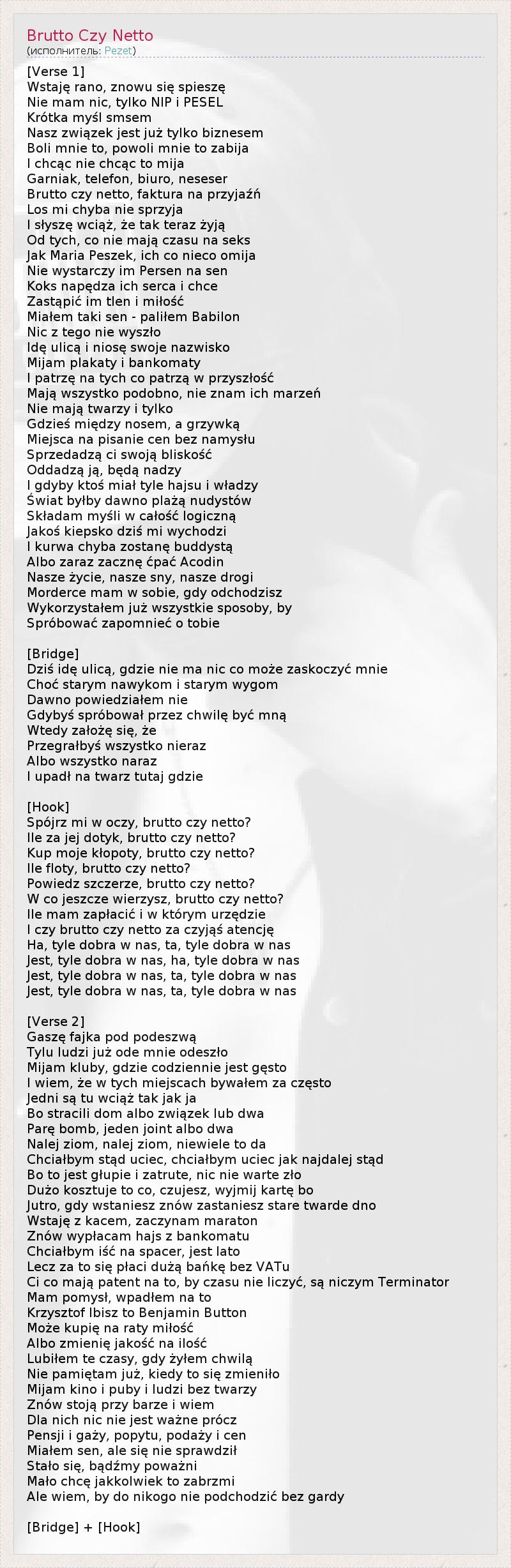 [Verse 1] Wstaję rano, znowu się spieszę Nie mam nic, tylko NIP i PESEL Krótka myśl smsem Nasz związek jest już tylko biznesem Boli mnie to, powoli mnie to zabija I chcąc nie chcąc to mija Garniak, telefon, biuro, neseser Brutto czy netto, faktura na przyjaźń Los mi chyba nie sprzyja I słyszę wciąż, że tak teraz żyją Od tych, co nie mają czasu na seks Jak Maria Peszek, ich co nieco omija Nie wystarczy im Persen na sen Koks napędza ich serca i chce Zastąpić im tlen i miłość Miałem taki sen - paliłem Babilon Nic z tego nie wyszło Idę ulicą i niosę swoje nazwisko Mijam plakaty i bankomaty I patrzę na tych co patrzą w przyszłość Mają wszystko podobno, nie znam ich marzeń Nie mają twarzy i tylko Gdzieś między nosem, a grzywką Miejsca na pisanie cen bez namysłu Sprzedadzą ci swoją bliskość Oddadzą ją, będą nadzy I gdyby ktoś miał tyle hajsu i władzy Świat byłby dawno plażą nudystów Składam myśli w całość logiczną Jakoś kiepsko dziś mi wychodzi I kurwa chyba zostanę buddystą Albo zaraz zacznę ćpać Acodin Nasze życie, nasze sny, nasze drogi Morderce mam w sobie, gdy odchodzisz Wykorzystałem już wszystkie sposoby, by Spróbować zapomnieć o tobie [Bridge] Dziś idę ulicą, gdzie nie ma nic co może zaskoczyć mnie Choć starym nawykom i starym wygom Dawno powiedziałem nie Gdybyś spróbował przez chwilę być mną Wtedy założę się, że Przegrałbyś wszystko nieraz Albo wszystko naraz I upadł na twarz tutaj gdzie [Hook] Spójrz mi w oczy, brutto czy netto? Ile za jej dotyk, brutto czy netto? Kup moje kłopoty, brutto czy netto? Ile floty, brutto czy netto? Powiedz szczerze, brutto czy netto? W co jeszcze wierzysz, brutto czy netto? Ile mam zapłacić i w którym urzędzie I czy brutto czy netto za czyjąś atencję Ha, tyle dobra w nas, ta, tyle dobra w nas Jest, tyle dobra w nas, ha, tyle dobra w nas Jest, tyle dobra w nas, ta, tyle dobra w nas Jest, tyle dobra w nas, ta, tyle dobra w nas [Verse 2] Gaszę fajka pod podeszwą Tylu ludzi już ode mnie odeszło Mijam kluby, gdzie codziennie jest gęsto I wiem, że w tych miejscach bywałem za często Jedni są tu wciąż tak jak ja Bo stracili dom albo związek lub dwa Parę bomb, jeden joint albo dwa Nalej ziom, nalej ziom, niewiele to da Chciałbym stąd uciec, chciałbym uciec jak najdalej stąd Bo to jest głupie i zatrute, nic nie warte zło Dużo kosztuje to co, czujesz, wyjmij kartę bo Jutro, gdy wstaniesz znów zastaniesz stare twarde dno Wstaję z kacem, zaczynam maraton Znów wypłacam hajs z bankomatu Chciałbym iść na spacer, jest lato Lecz za to się płaci dużą bańkę bez VATu Ci co mają patent na to, by czasu nie liczyć, są niczym Terminator Mam pomysł, wpadłem na to Krzysztof Ibisz to Benjamin Button Może kupię na raty miłość Albo zmienię jakość na ilość Lubiłem te czasy, gdy żyłem chwilą Nie pamiętam już, kiedy to się zmieniło Mijam kino i puby i ludzi bez twarzy Znów stoją przy barze i wiem Dla nich nic nie jest ważne prócz Pensji i gaży, popytu, podaży i cen Miałem sen, ale się nie sprawdził Stało się, bądźmy poważni Mało chcę jakkolwiek to zabrzmi Ale wiem, by do nikogo nie podchodzić bez gardy [Bridge] + [Hook]