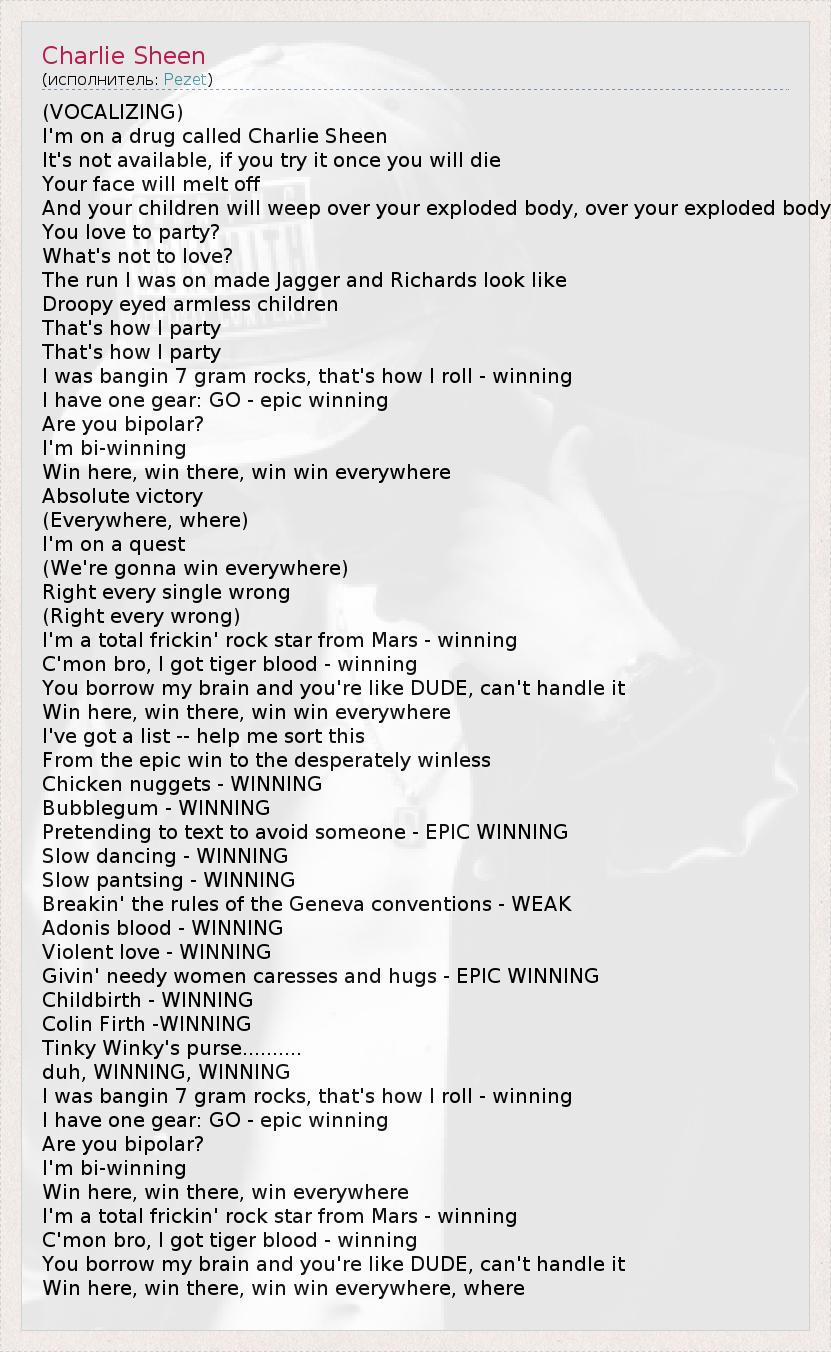 (VOCALIZING) I'm on a drug called Charlie Sheen It's not available, if you try it once you will die Your face will melt off And your children will weep over your exploded body, over your exploded body You love to party? What's not to love? The run I was on made Jagger and Richards look like Droopy eyed armless children That's how I party That's how I party I was bangin 7 gram rocks, that's how I roll - winning I have one gear: GO - epic winning Are you bipolar? I'm bi-winning Win here, win there, win win everywhere Absolute victory (Everywhere, where) I'm on a quest (We're gonna win everywhere) Right every single wrong (Right every wrong) I'm a total frickin' rock star from Mars - winning C'mon bro, I got tiger blood - winning You borrow my brain and you're like DUDE, can't handle it Win here, win there, win win everywhere I've got a list -- help me sort this From the epic win to the desperately winless Chicken nuggets - WINNING Bubblegum - WINNING Pretending to text to avoid someone - EPIC WINNING Slow dancing - WINNING Slow pantsing - WINNING Breakin' the rules of the Geneva conventions - WEAK Adonis blood - WINNING Violent love - WINNING Givin' needy women caresses and hugs - EPIC WINNING Childbirth - WINNING Colin Firth -WINNING Tinky Winky's purse.......... duh, WINNING, WINNING I was bangin 7 gram rocks, that's how I roll - winning I have one gear: GO - epic winning Are you bipolar? I'm bi-winning Win here, win there, win everywhere I'm a total frickin' rock star from Mars - winning C'mon bro, I got tiger blood - winning You borrow my brain and you're like DUDE, can't handle it Win here, win there, win win everywhere, where