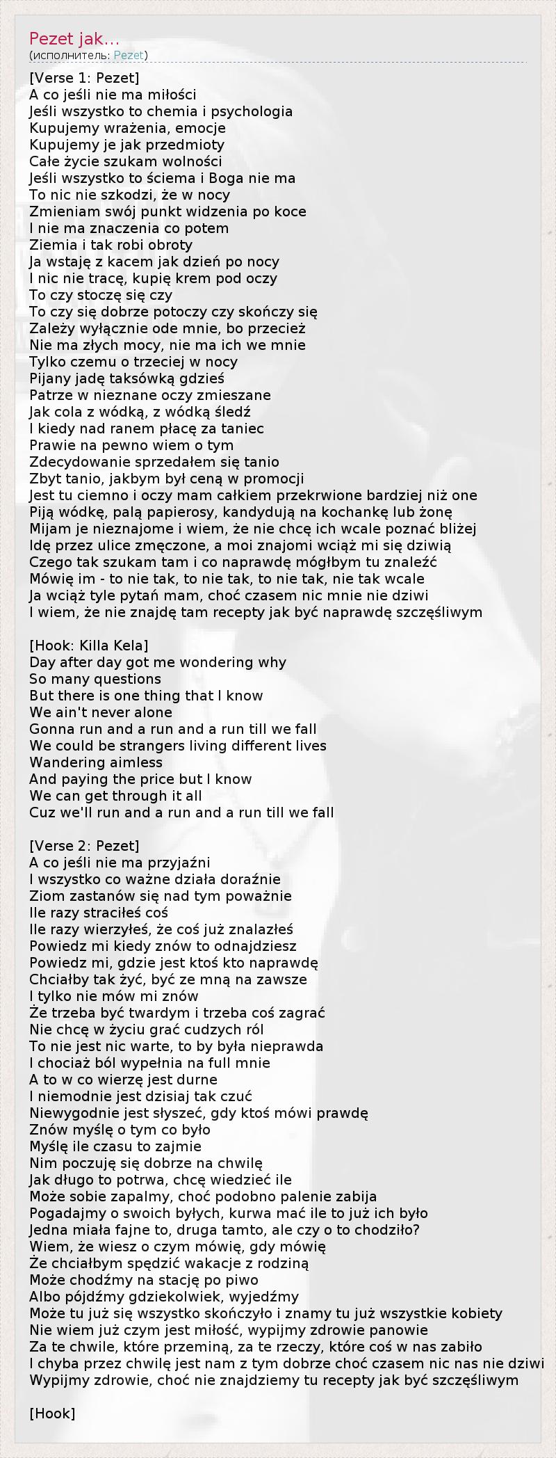[Verse 1: Pezet] A co jeśli nie ma miłości Jeśli wszystko to chemia i psychologia Kupujemy wrażenia, emocje Kupujemy je jak przedmioty Całe życie szukam wolności Jeśli wszystko to ściema i Boga nie ma To nic nie szkodzi, że w nocy Zmieniam swój punkt widzenia po koce I nie ma znaczenia co potem Ziemia i tak robi obroty Ja wstaję z kacem jak dzień po nocy I nic nie tracę, kupię krem pod oczy To czy stoczę się czy To czy się dobrze potoczy czy skończy się Zależy wyłącznie ode mnie, bo przecież Nie ma złych mocy, nie ma ich we mnie Tylko czemu o trzeciej w nocy Pijany jadę taksówką gdzieś Patrze w nieznane oczy zmieszane Jak cola z wódką, z wódką śledź I kiedy nad ranem płacę za taniec Prawie na pewno wiem o tym Zdecydowanie sprzedałem się tanio Zbyt tanio, jakbym był ceną w promocji Jest tu ciemno i oczy mam całkiem przekrwione bardziej niż one Piją wódkę, palą papierosy, kandydują na kochankę lub żonę Mijam je nieznajome i wiem, że nie chcę ich wcale poznać bliżej Idę przez ulice zmęczone, a moi znajomi wciąż mi się dziwią Czego tak szukam tam i co naprawdę mógłbym tu znaleźć Mówię im - to nie tak, to nie tak, to nie tak, nie tak wcale Ja wciąż tyle pytań mam, choć czasem nic mnie nie dziwi I wiem, że nie znajdę tam recepty jak być naprawdę szczęśliwym [Hook: Killa Kela] Day after day got me wondering why So many questions But there is one thing that I know We ain't never alone Gonna run and a run and a run till we fall We could be strangers living different lives Wandering aimless And paying the price but I know We can get through it all Cuz we'll run and a run and a run till we fall [Verse 2: Pezet] A co jeśli nie ma przyjaźni I wszystko co ważne działa doraźnie Ziom zastanów się nad tym poważnie Ile razy straciłeś coś Ile razy wierzyłeś, że coś już znalazłeś Powiedz mi kiedy znów to odnajdziesz Powiedz mi, gdzie jest ktoś kto naprawdę Chciałby tak żyć, być ze mną na zawsze I tylko nie mów mi znów Że trzeba być twardym i trzeba coś zagrać Nie chcę w życiu grać cudzych ról To nie jest nic warte, to by była nieprawda I chociaż ból wypełnia na full mnie A to w co wierzę jest durne I niemodnie jest dzisiaj tak czuć Niewygodnie jest słyszeć, gdy ktoś mówi prawdę Znów myślę o tym co było Myślę ile czasu to zajmie Nim poczuję się dobrze na chwilę Jak długo to potrwa, chcę wiedzieć ile Może sobie zapalmy, choć podobno palenie zabija Pogadajmy o swoich byłych, kurwa mać ile to już ich było Jedna miała fajne to, druga tamto, ale czy o to chodziło? Wiem, że wiesz o czym mówię, gdy mówię Że chciałbym spędzić wakacje z rodziną Może chodźmy na stację po piwo Albo pójdźmy gdziekolwiek, wyjedźmy Może tu już się wszystko skończyło i znamy tu już wszystkie kobiety Nie wiem już czym jest miłość, wypijmy zdrowie panowie Za te chwile, które przeminą, za te rzeczy, które coś w nas zabiło I chyba przez chwilę jest nam z tym dobrze choć czasem nic nas nie dziwi Wypijmy zdrowie, choć nie znajdziemy tu recepty jak być szczęśliwym [Hook]