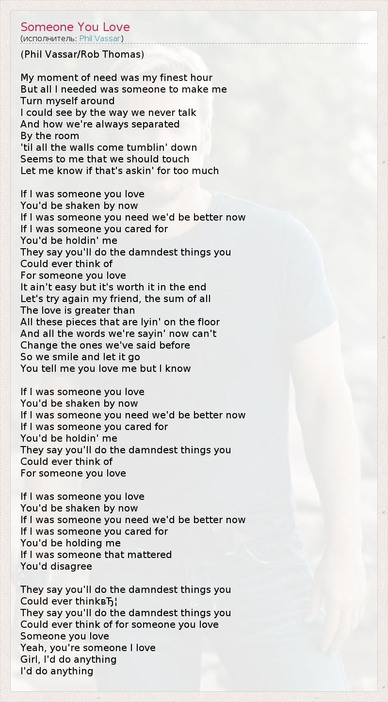 Это интересно:Фил Вассар – певец, поэт-песенник, слишком популярная творческая личность.Он родился 28-го мая в 1964-ом году, в Линчберге – маленьком живописном городке. Его мать занималась воспитанием детей (заботилась о Филе и о его двух младших сестренках). Отец Фила был певцом и довольно-таки успешно выступал в местном ресторанчике.В глубоком детстве интересы Фила Вассара не сосредотачивались... продолжение