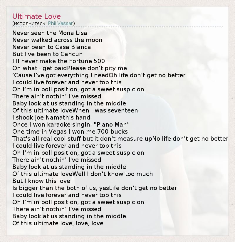 Never seen the Mona Lisa Never walked across the moon Never been to Casa Blanca But I've been to Cancun I'll never make the Fortune 500 On what I get paidPlease don't pity me 'Cause I've got everything I needOh life don't get no better I could live forever and never top this Oh I'm in poll position, got a sweet suspicion There ain't nothin' I've missed Baby look at us standing in the middle Of this ultimate loveWhen I was seventeen I shook Joe Namath's hand Once I won karaoke singin' "Piano Man" One time in Vegas I won me 700 bucks That's all real cool stuff but it don't measure upNo life don't get no better I could live forever and never top this Oh I'm in poll position, got a sweet suspicion There ain't nothin' I've missed Baby look at us standing in the middle Of this ultimate loveWell I don't know too much But I know this love Is bigger than the both of us, yesLife don't get no better I could live forever and never top this Oh I'm in poll position, got a sweet suspicion There ain't nothin' I've missed Baby look at us standing in the middle Of this ultimate love, love, love