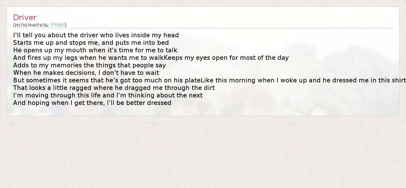 Это интересно:Phish — американская рок-группа, примечательная своими джем-сейшнами, импровизациями и постмодернистским смешением жанров. Phish была образована в 1983 году в университете Вермонта. Четыре ее участника выступали вместе 21 год, пока не распались в августе 2004 года. Их музыка содержала в себе элементы широкoго спектра жанров, и каждый их концерт был оригинальным в плане исполнения песен, порядка... продолжение