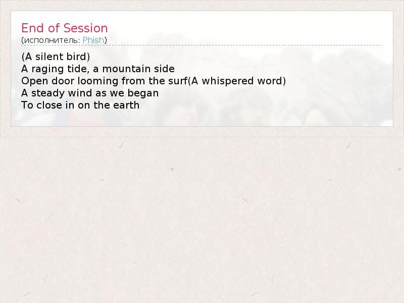 Это интересно:Phish — американская рок-группа, примечательная своими джем-сейшнами, импровизациями и постмодернистским смешением жанров. Phish была образована в 1983 году в университете Вермонта. Четыре ее участника выступали вместе 21 год, пока не распались в августе 2004 года. Их музыка содержала в себе элементы широкoго спектра жанров, и каждый их концерт был оригинальным в плане исполнения песен, порядка... продолжение