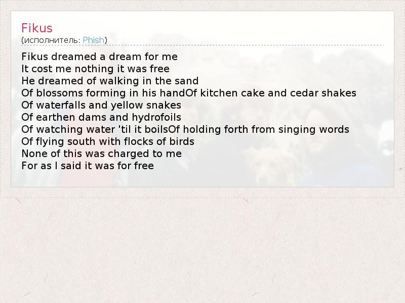 Fikus dreamed a dream for me It cost me nothing it was free He dreamed of walking in the sand Of blossoms forming in his handOf kitchen cake and cedar shakes Of waterfalls and yellow snakes Of earthen dams and hydrofoils Of watching water 'til it boilsOf holding forth from singing words Of flying south with flocks of birds None of this was charged to me For as I said it was for free