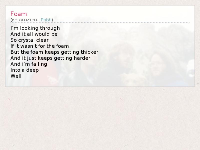 Это интересно:Phish — американская рок-группа, примечательная своими джем-сейшнами, импровизациями и постмодернистским смешением жанров. Phish была образована в 1983 году в университете Вермонта. Четыре ее участника выступали вместе 21 год, пока не распались в августе 2004 года. Их музыка содержала в себе элементы широкoго спектра жанров, и каждый их концерт был оригинальным в плане исполнения песен, порядка... продолжение